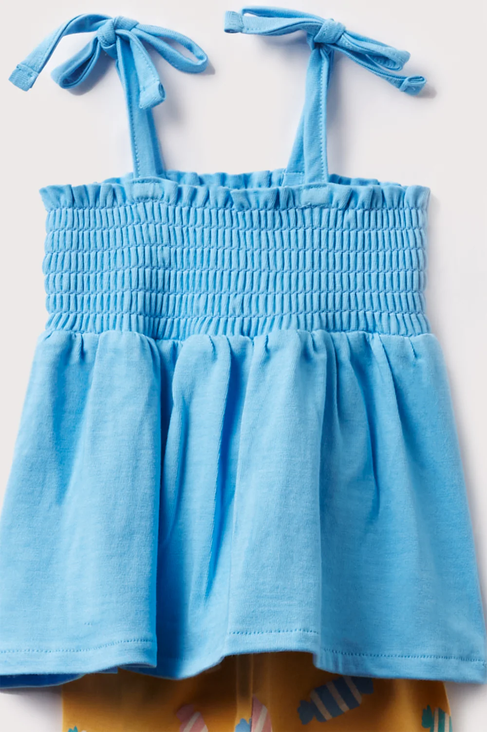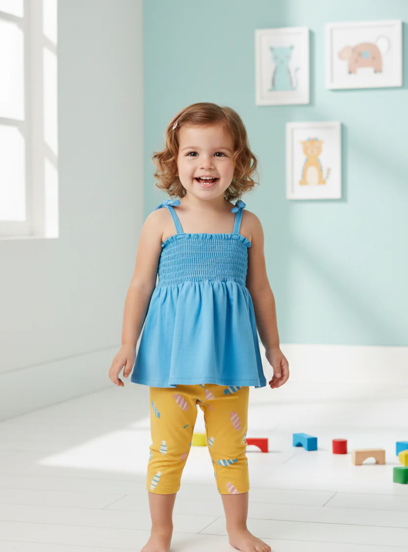 Conjunto legging miel con dibujos de caramelos y camiseta turquesa de tirantes