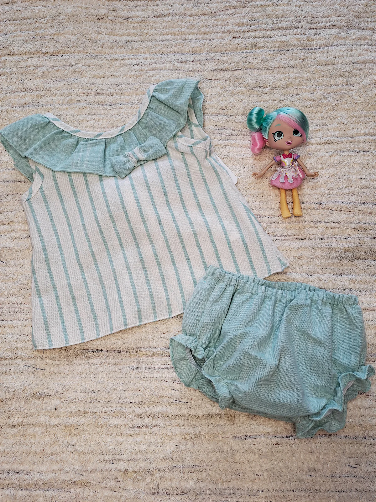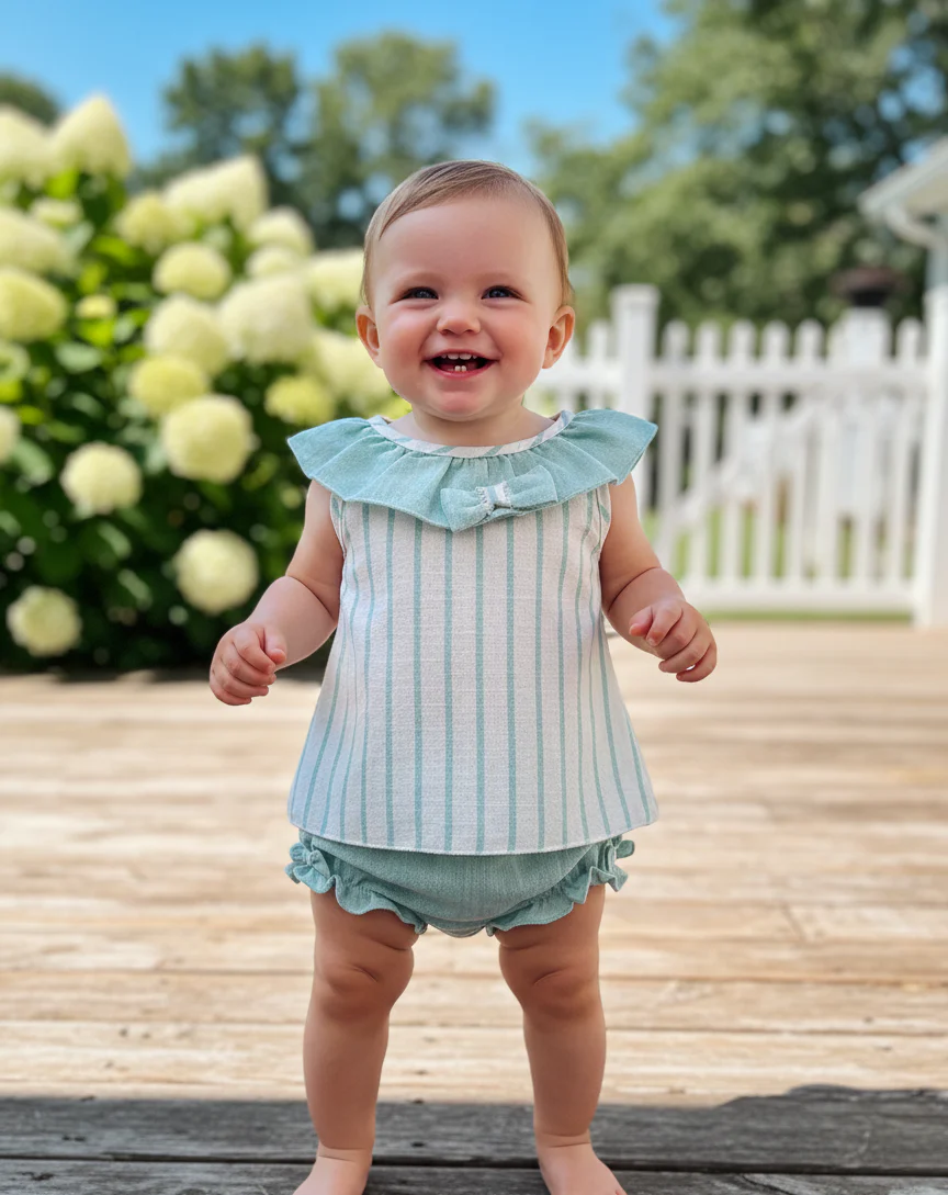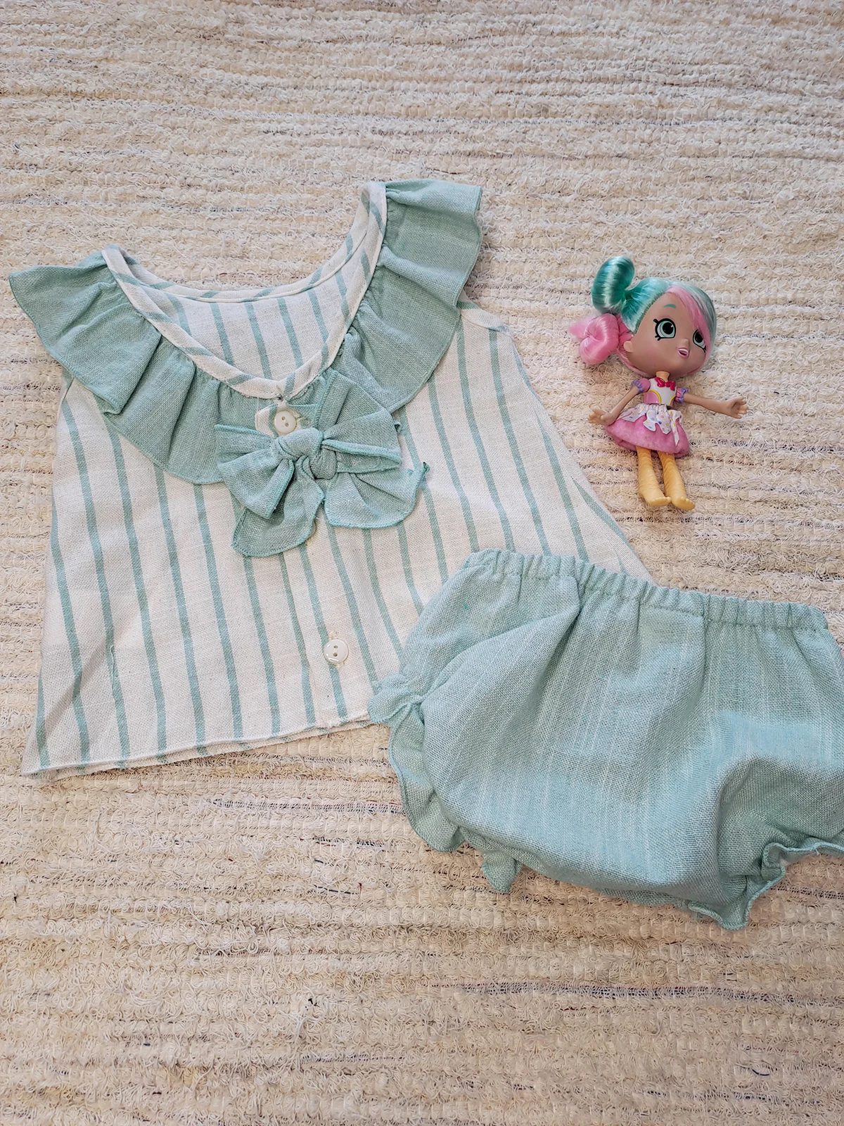 Conjunto de de braguita crema y verde agua de tela 50% lino y 50% algodón.