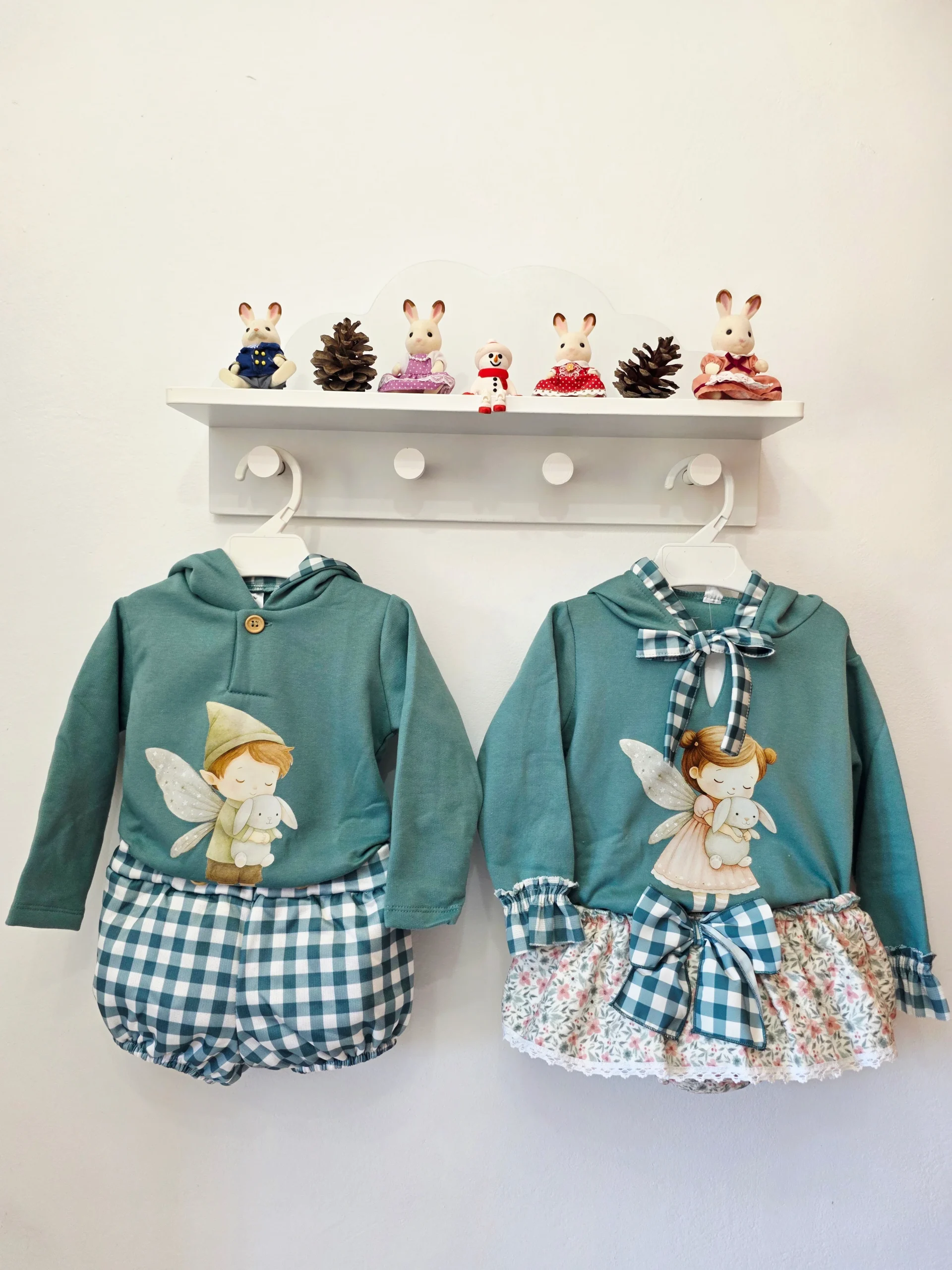 • Tejido y Patrón: La parte inferior es un bombacho o pantalón corto con un patrón de cuadros vichy en color blanco y el mismo tono verde azulado que la parte superior.