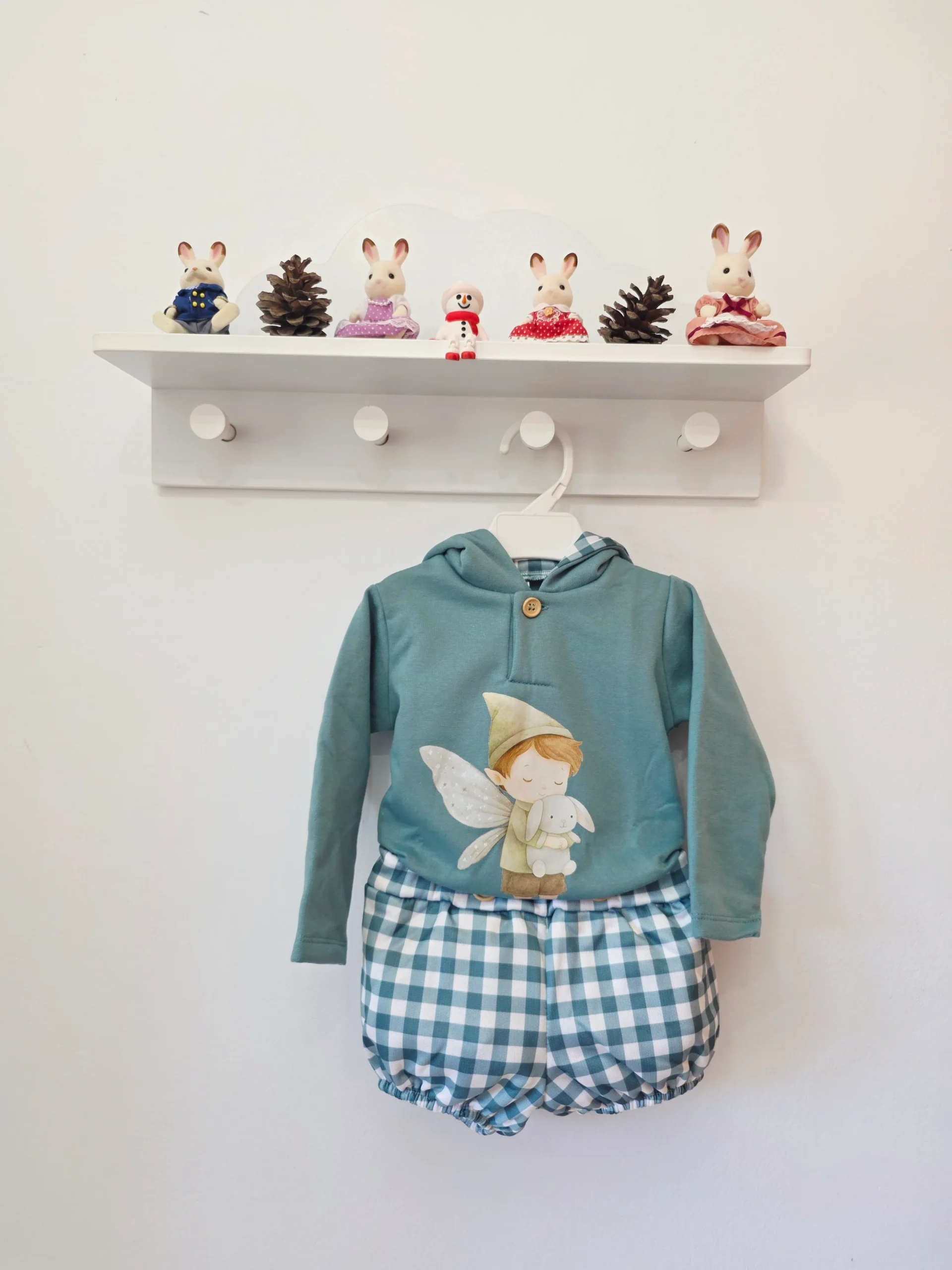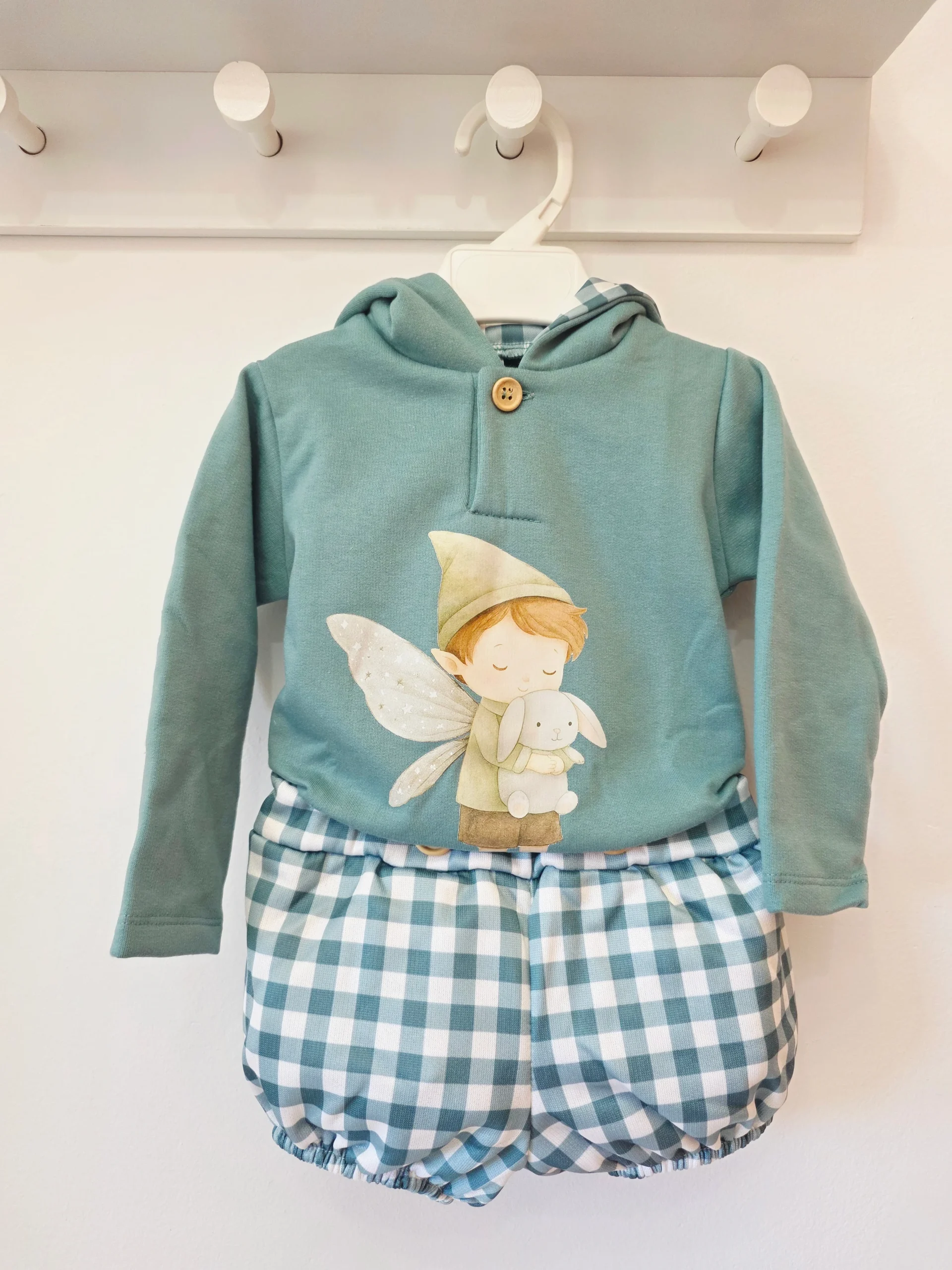 Estampado/Aplique: Presenta un gran y dulce aplique o impresión frontal de un personaje de cuento de hadas: un duende o hada niño con un sombrero puntiagudo, alas brillantes (que parecen tener un poco de purpurina o textura), abrazando a un conejito blanco.