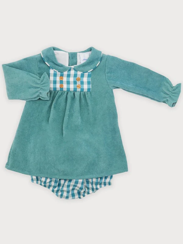 Este encantador conjunto para bebé niña combina la suavidad del tejido de pana con el encanto atemporal del estampado de cuadros vichy. El vestido en tono azul petróleo presenta detalles cuidadosamente diseñados: un delicado cuello Peter Pan ribeteado en cuadros, puños fruncidos a juego y un canesú frontal decorado con cuatro botones de madera que añaden un toque cálido y rústico. La braguita a juego, confeccionada con el mismo estampado de cuadros, asoma sutilmente bajo el vestido, completando el look con armonía y dulzura.