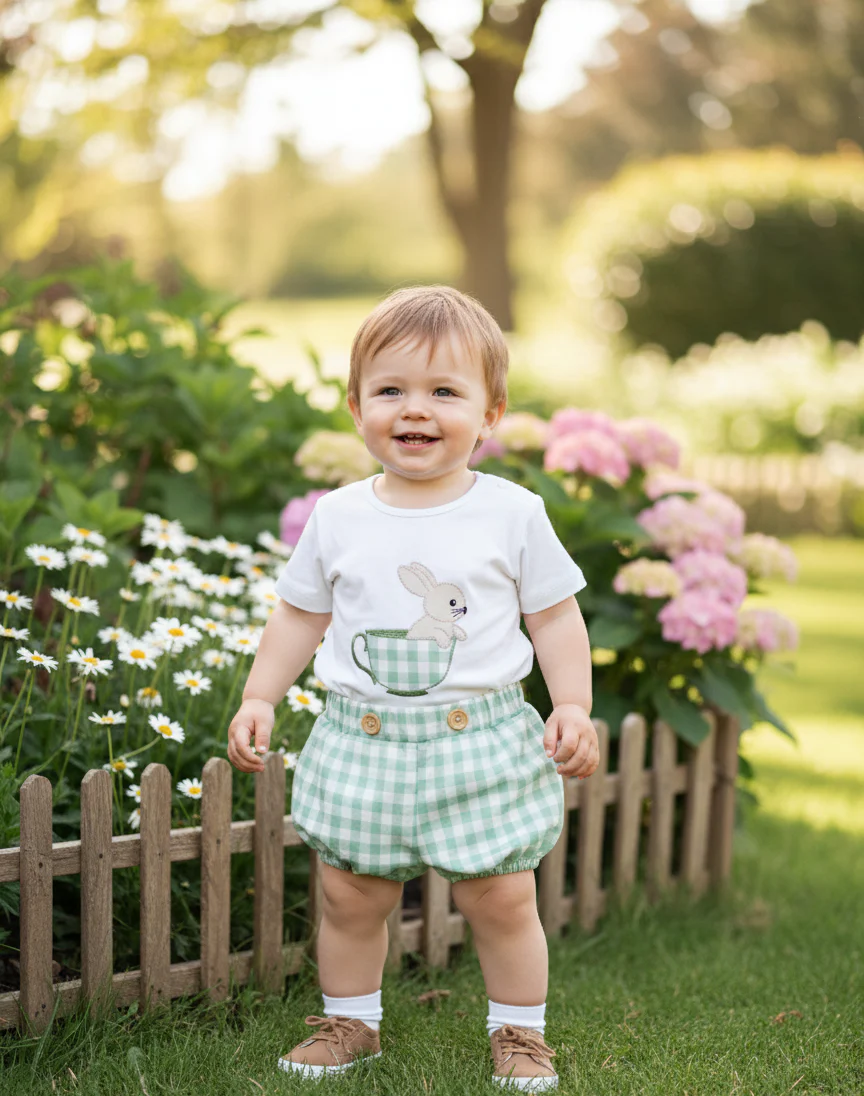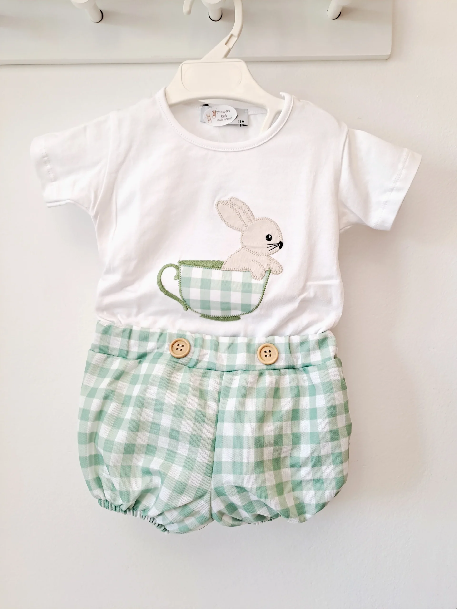 Conjunto camiseta algodón y pantalón en cuadros vichy verdes.