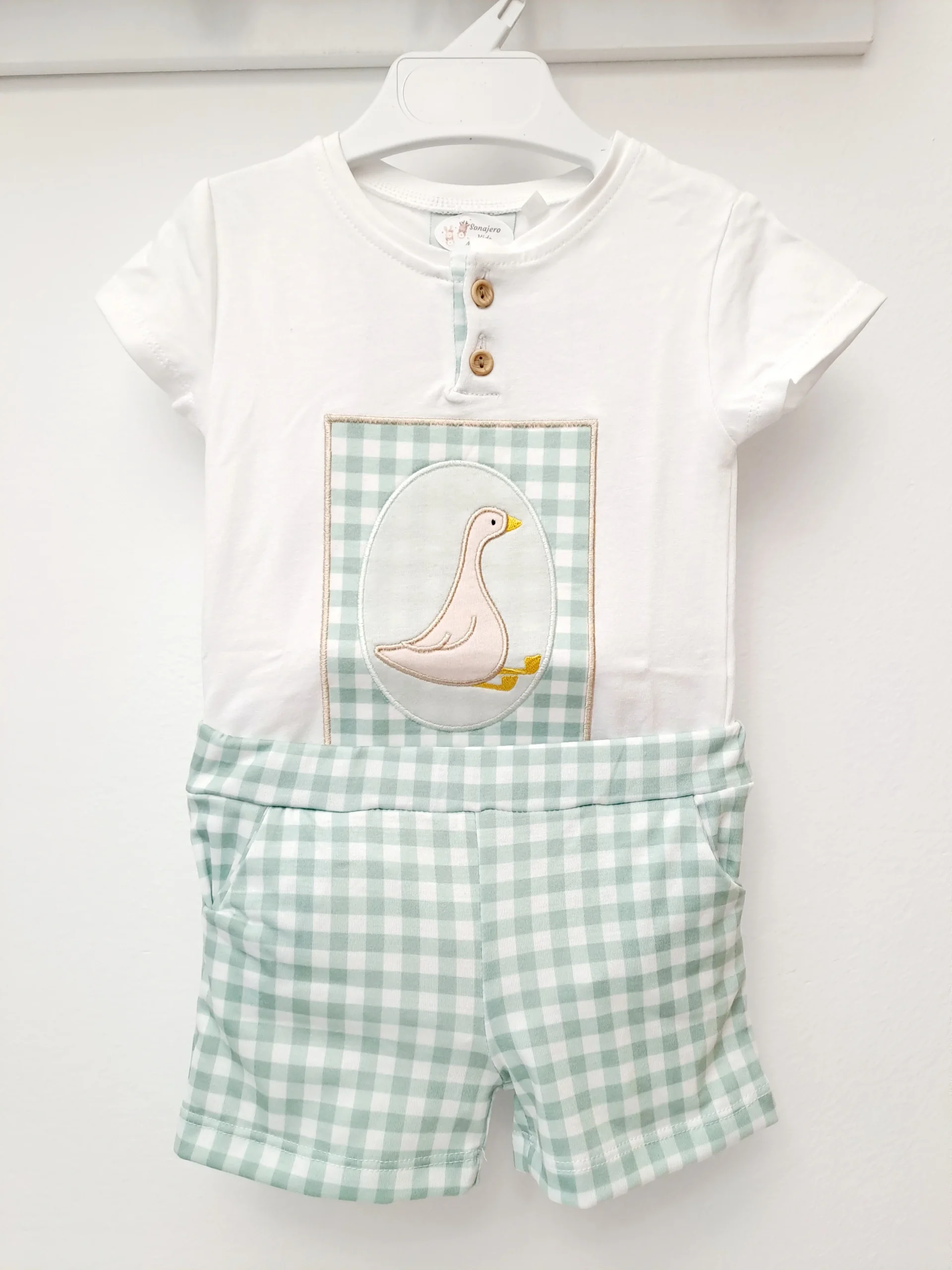 Conjunto de camiseta Blanca y pantalón celeste vichy.