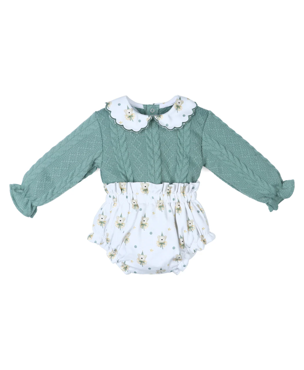 🌿Conjunto para bebé compuesto por una sudadera en suave lana color verde agua y pololo dulce de animalitos y estrellas. la sudadera un diseño trenzado en la parte delantera y botones de madera para un toque clásico y elegante. la sudadera tiene apertura delantera de botones con capucha