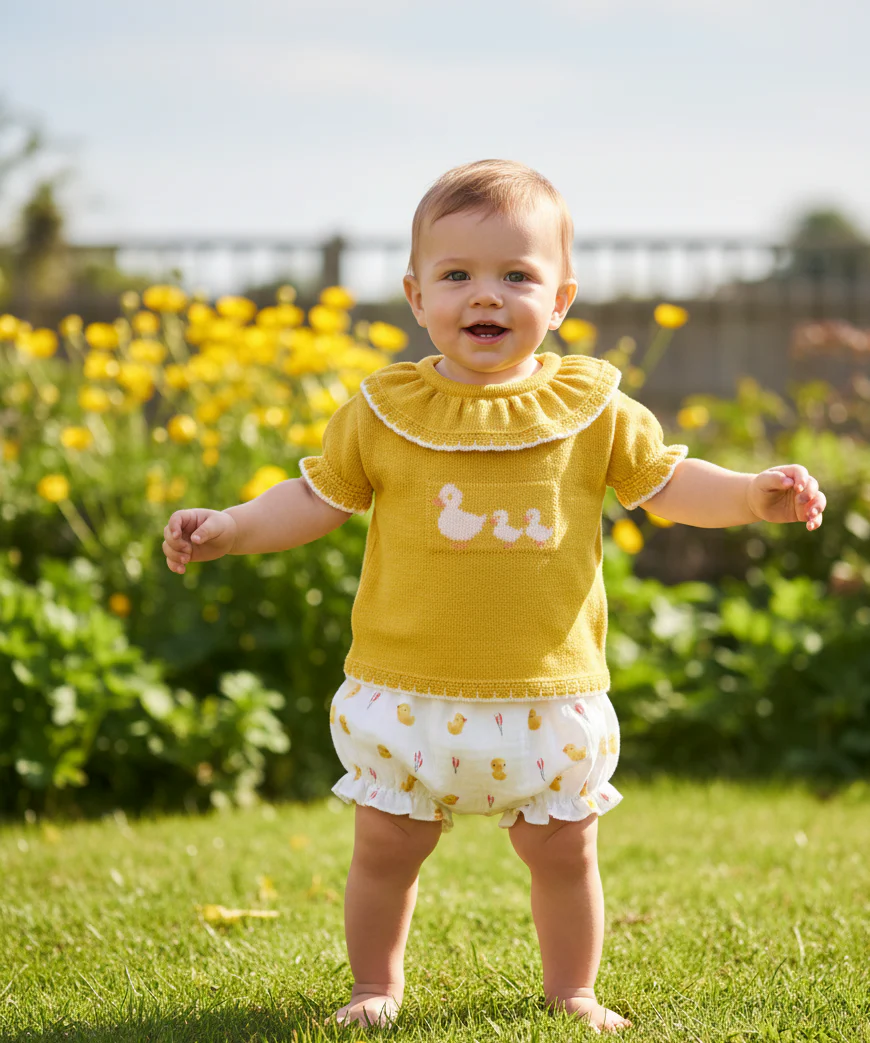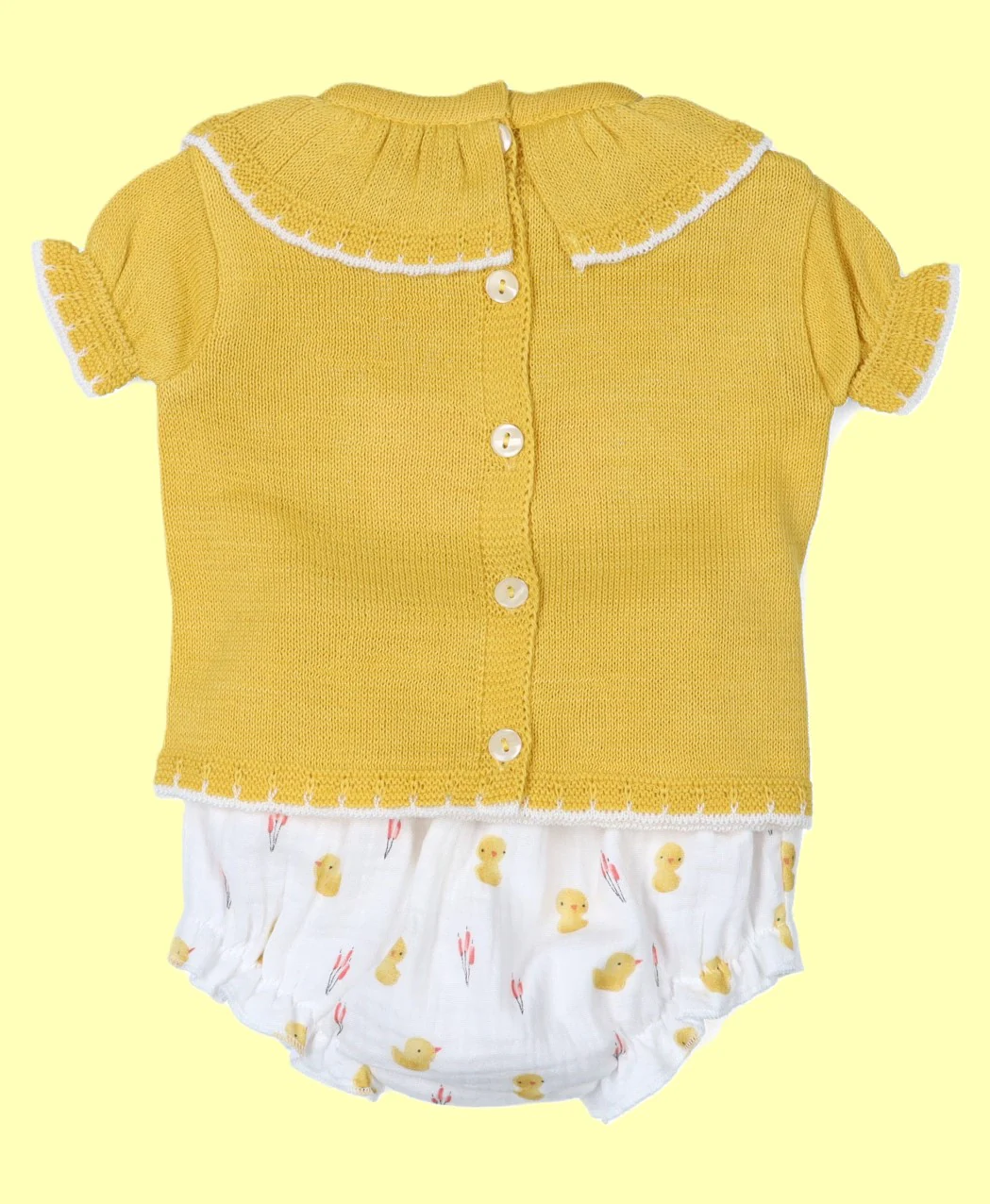 Conjunto de dos piezas y camiseta punto mostaza cuello a juego, apertura trasera. popys.