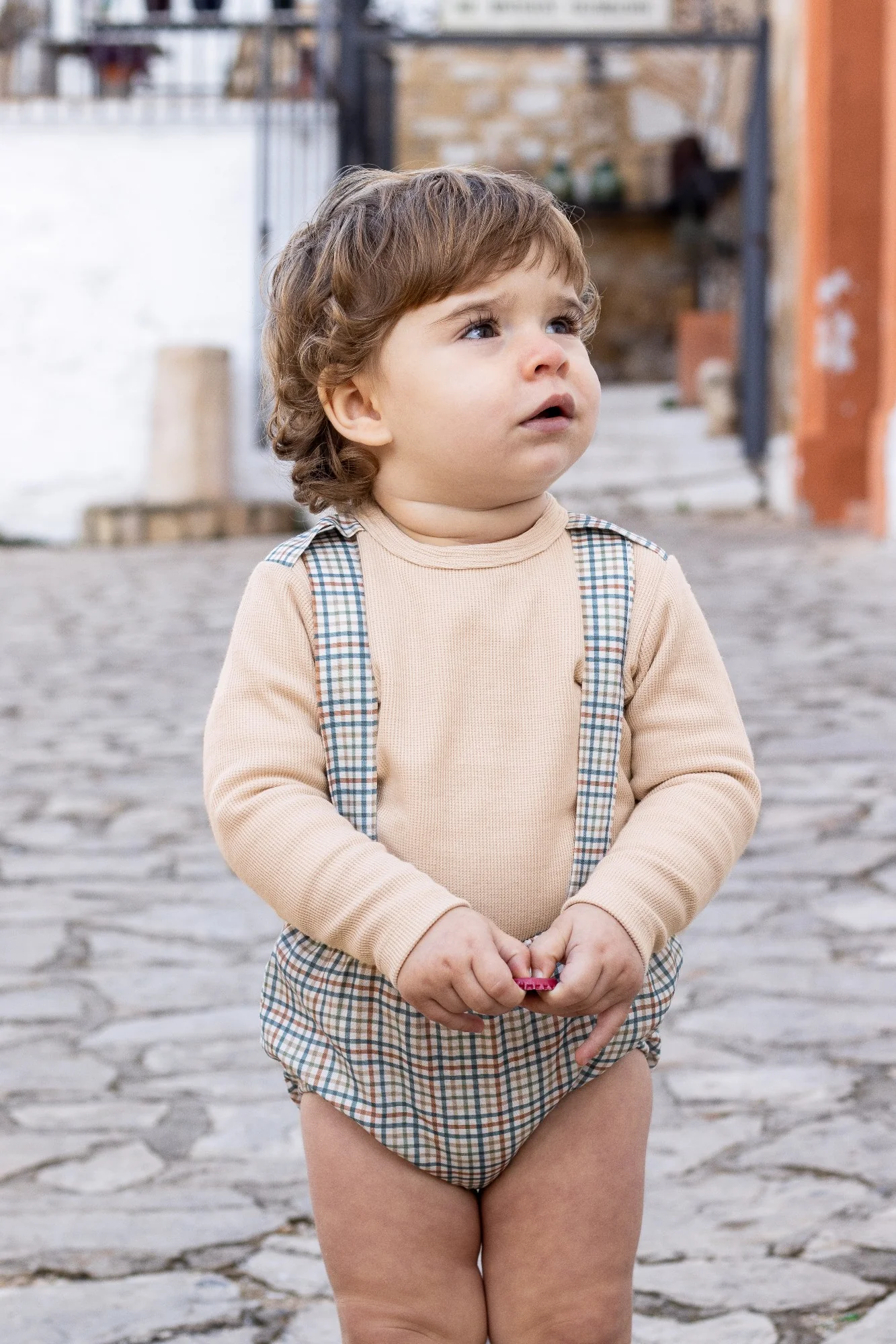 Conjunto de camiseta beige y pololo con tirantes a cuadros