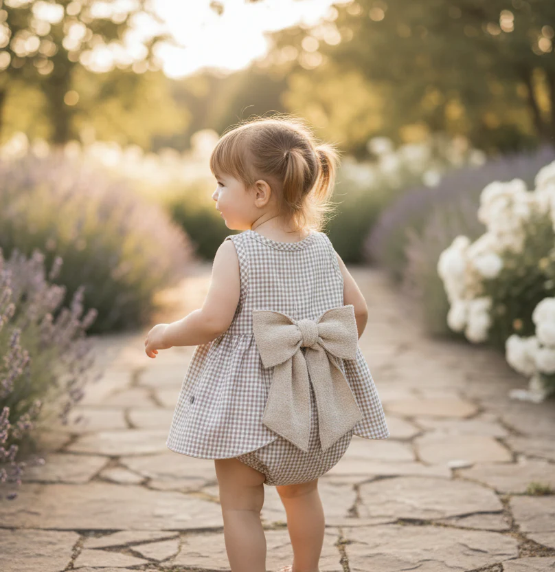 Conjunto de Dos Piezas para Bebé – Blanco y Beige Elegante conjunto compuesto por una camisa de manga corta en piqué blanco con cuello redondo y detalles en cuadro vichy, a juego con un cubrepañal de pana suave en tono arena. Incluye botones de madera decorativos que aportan un toque artesanal y atemporal. Perfecto para ocasiones especiales o paseos de verano.