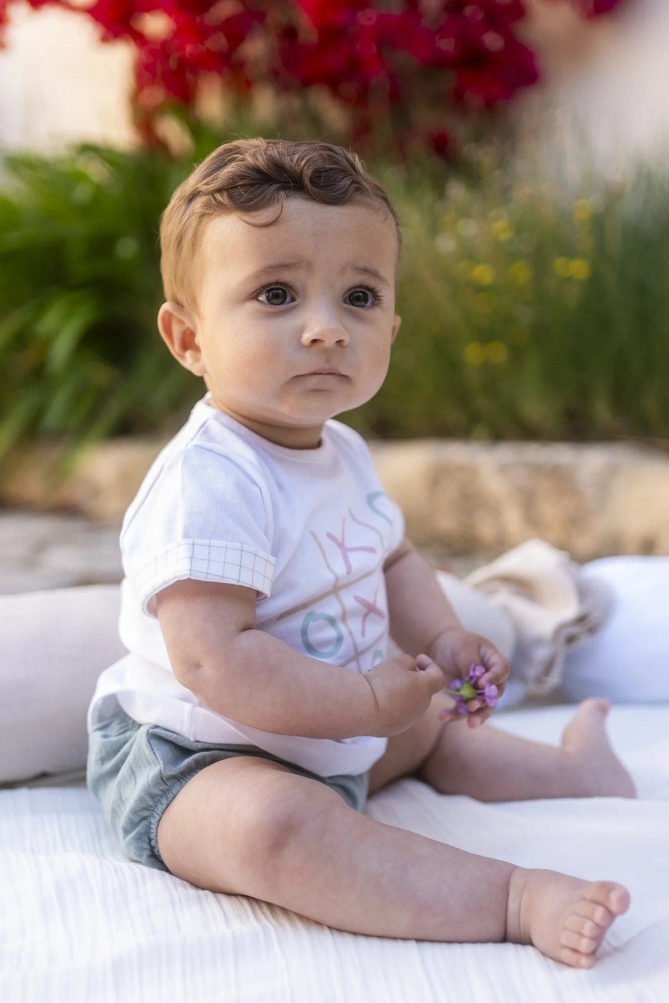 Camiseta de Algodón: Camiseta de cuello redondo en color blanco roto, con un divertido estampado central de «Tres en Raya» (Tic-Tac-Toe) en tonos melocotón y verde menta. Las mangas cortas presentan un detalle de vuelta con un sutil estampado de cuadros finos.