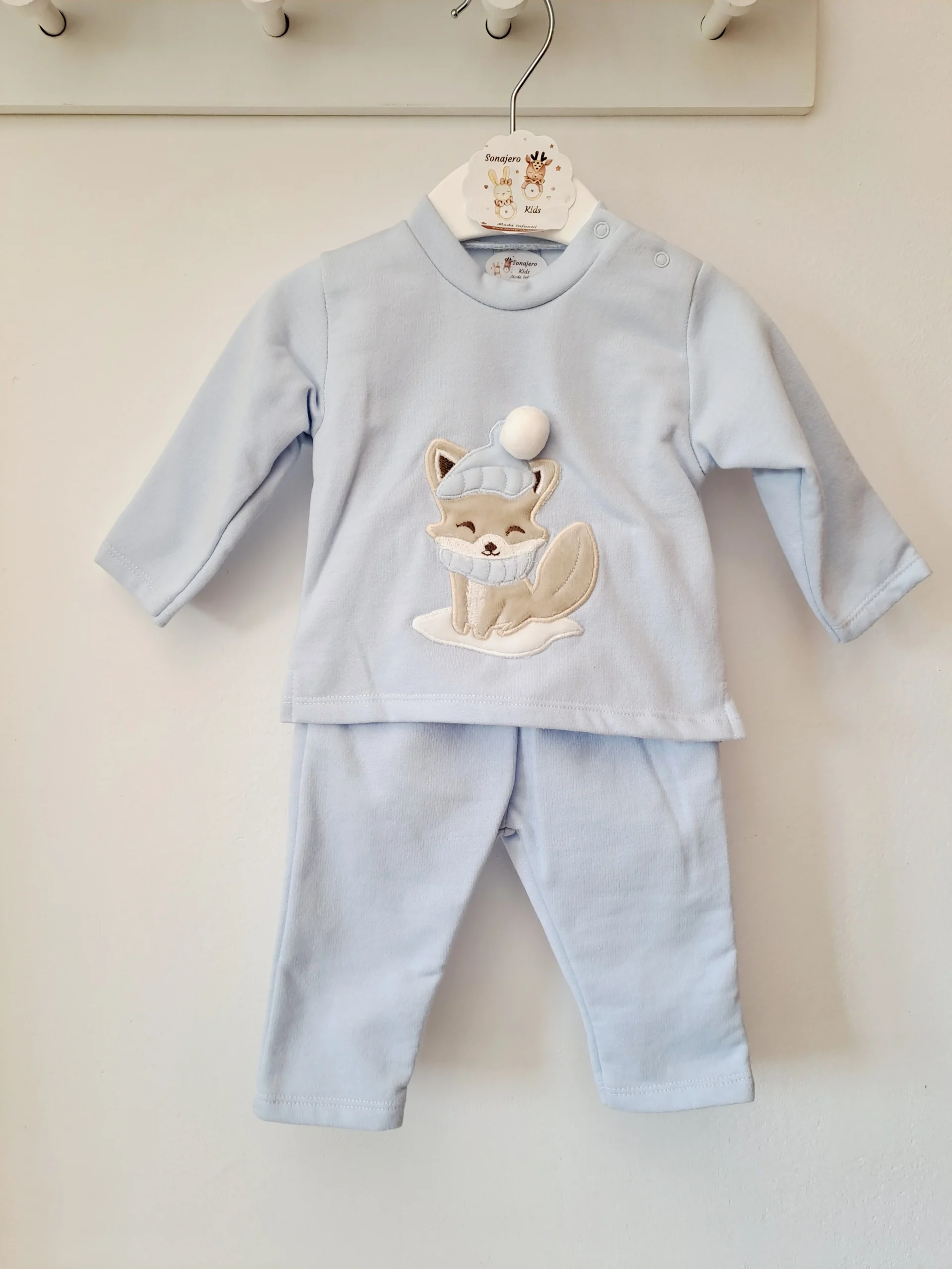 Conjunto de bebé de dos piezas en color celeste. Incluye sudadera y detalle de zorrito al frente. Pantalón a juego, cómodo y suave al tacto. Ideal para el día a día con estilo y ternura.