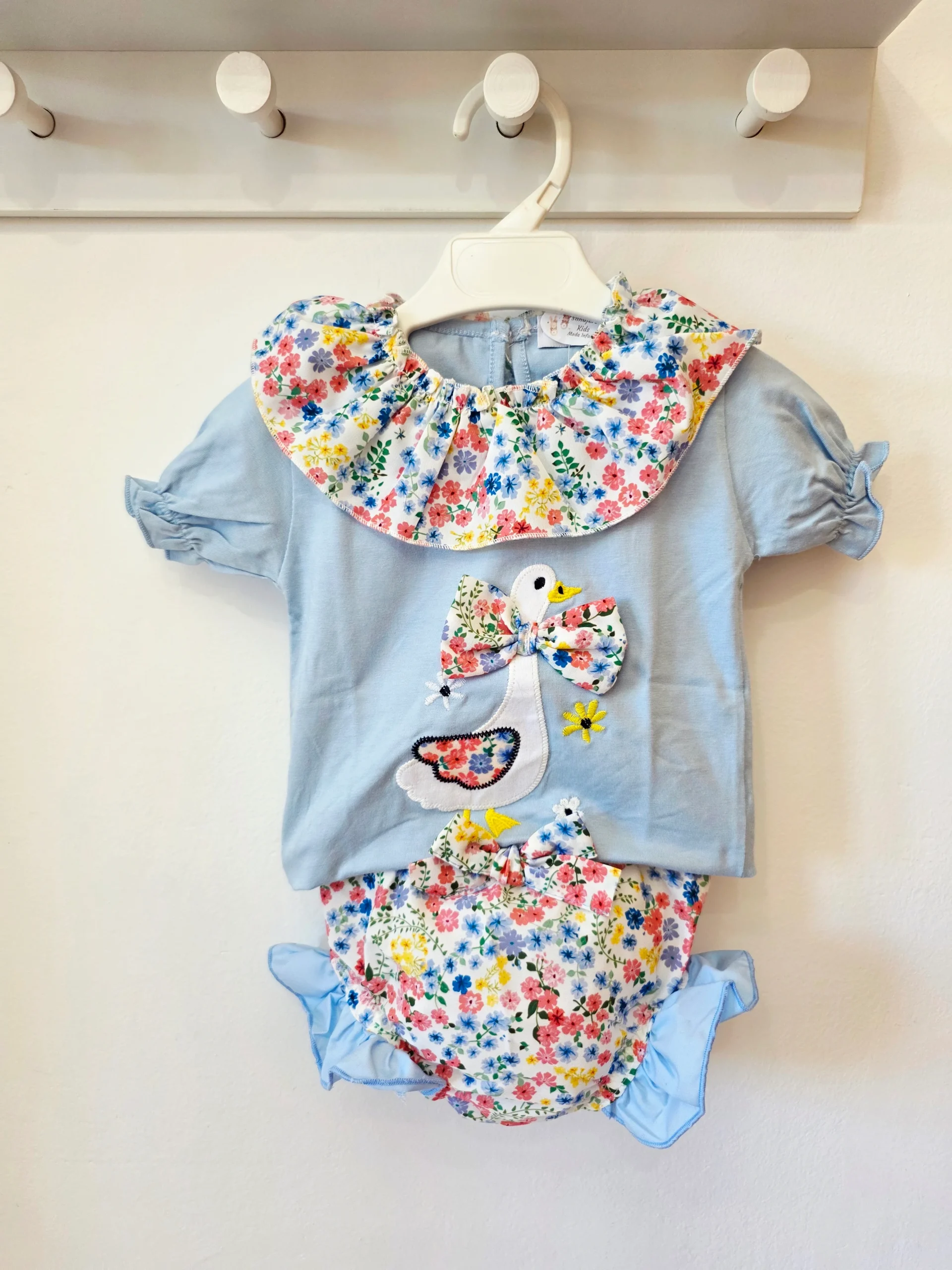 Descripción: Enamórate de este conjunto de dos piezas diseñado para llenar de alegría los días de tu pequeña. Combinamos la frescura del tejido en azul suave con un espectacular cuello volante extragrande en estampado floral, que se convierte en el gran protagonista del diseño.