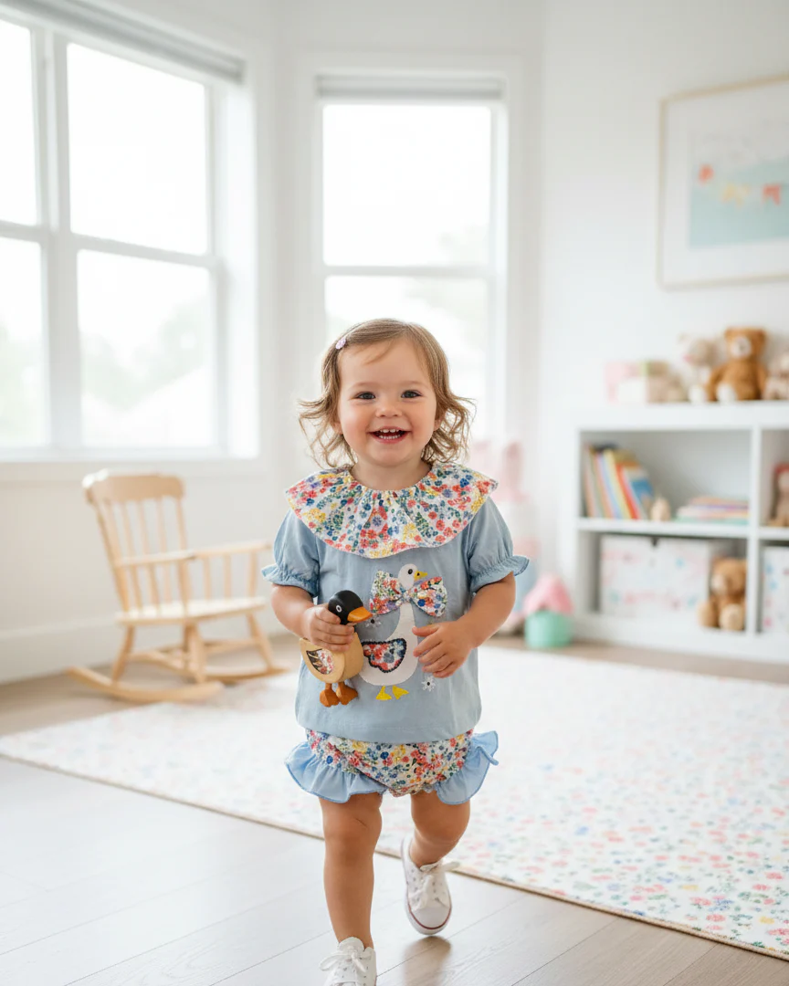 El toque tierno lo pone el aplique central de una oca con lazo a juego, bordado con delicadeza para asegurar la comodidad sobre la piel. El conjunto se completa con un cubrepañal con volantes, diseñado para dar volumen y permitir total libertad de movimiento mientras ella descubre el mundo.