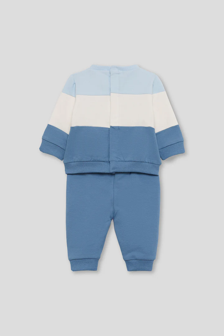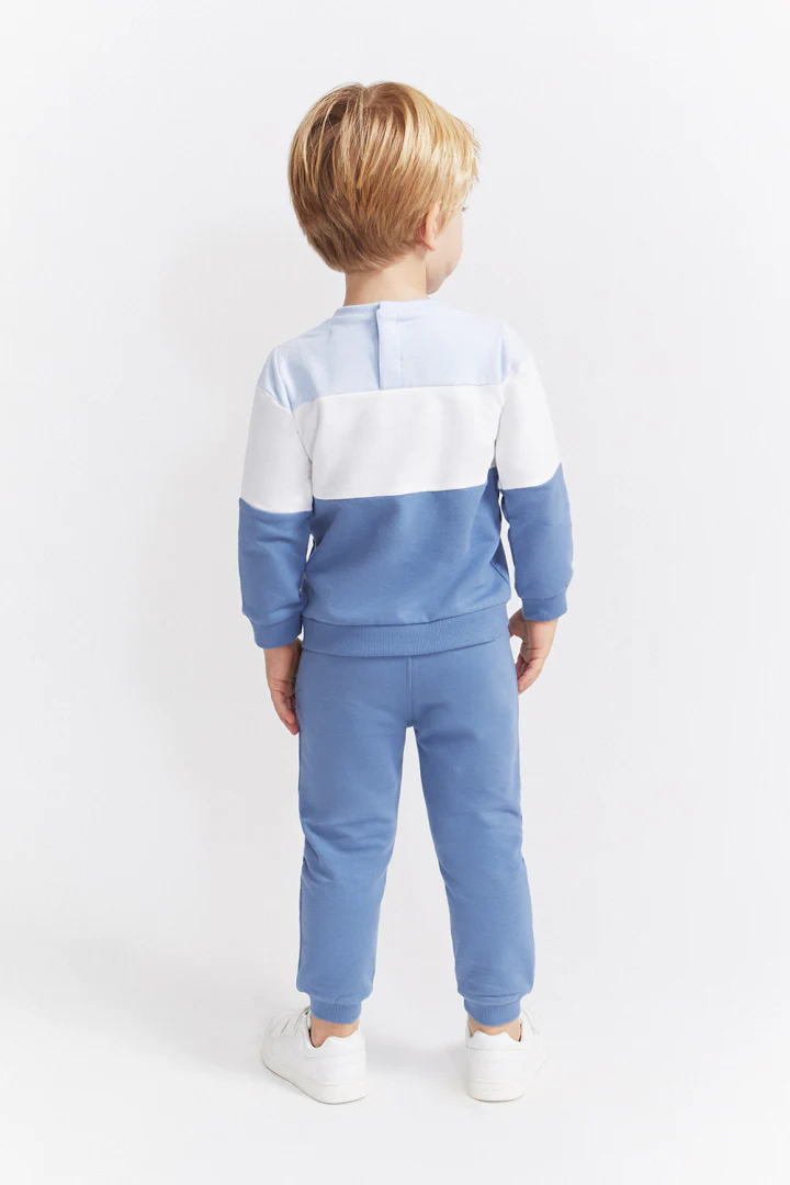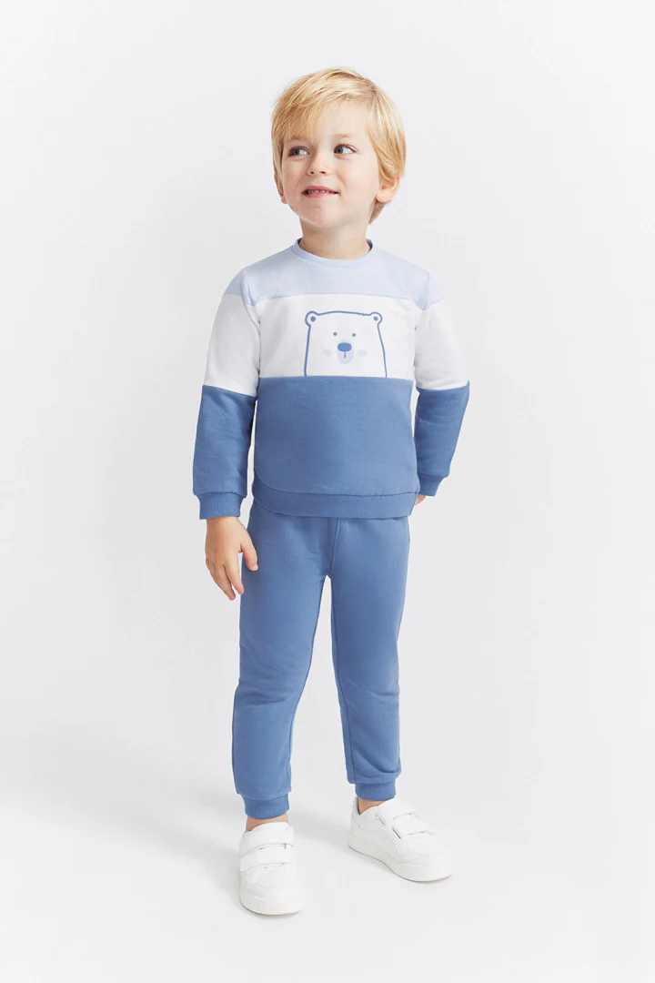 Confeccionado en felpa perchada, este conjunto incluye una sudadera en bloques de color azulina, blanco y celeste, con un simpático estampado de oso polar en el centro. El diseño presenta cuello redondo, manga larga y cierre trasero con automáticos para facilitar la puesta. El pantalón largo, en azulina a juego, cuenta con cinturilla elástica y bajos con puño para mayor comodidad.