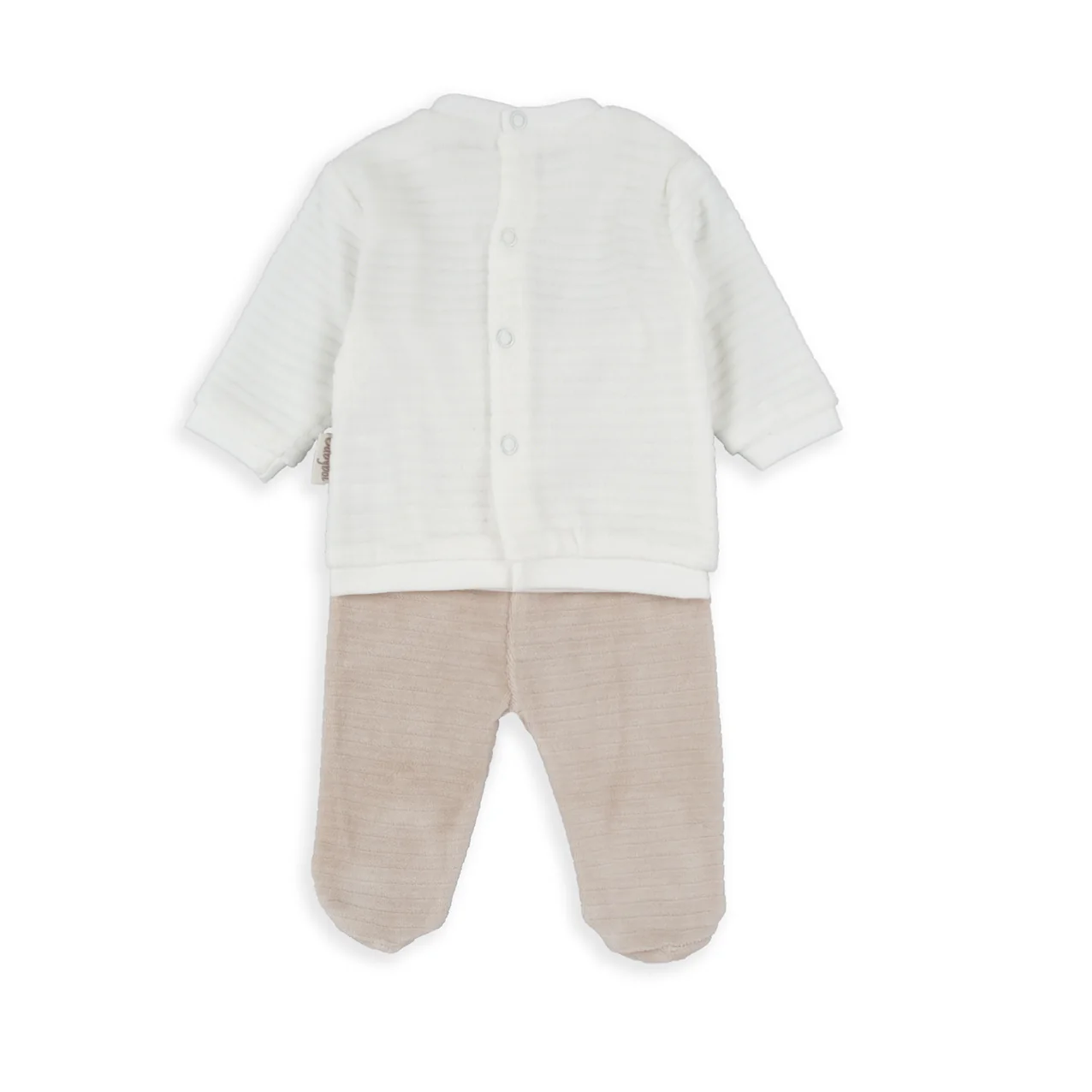 Conjunto de sudadera crema y pantalón beige.