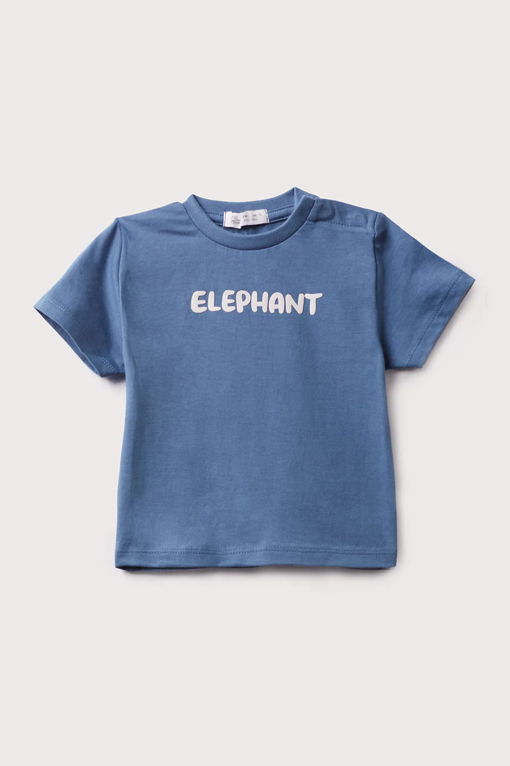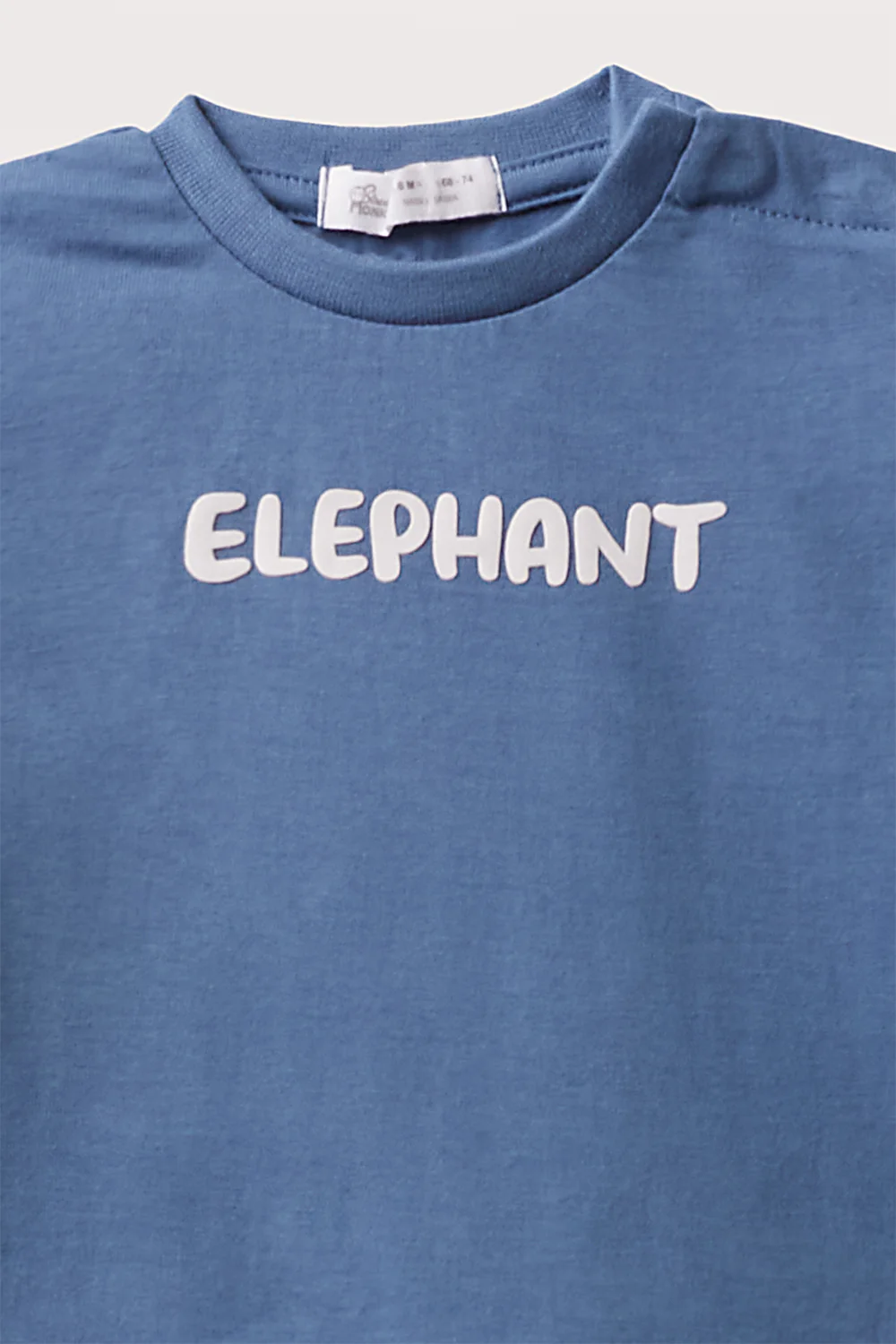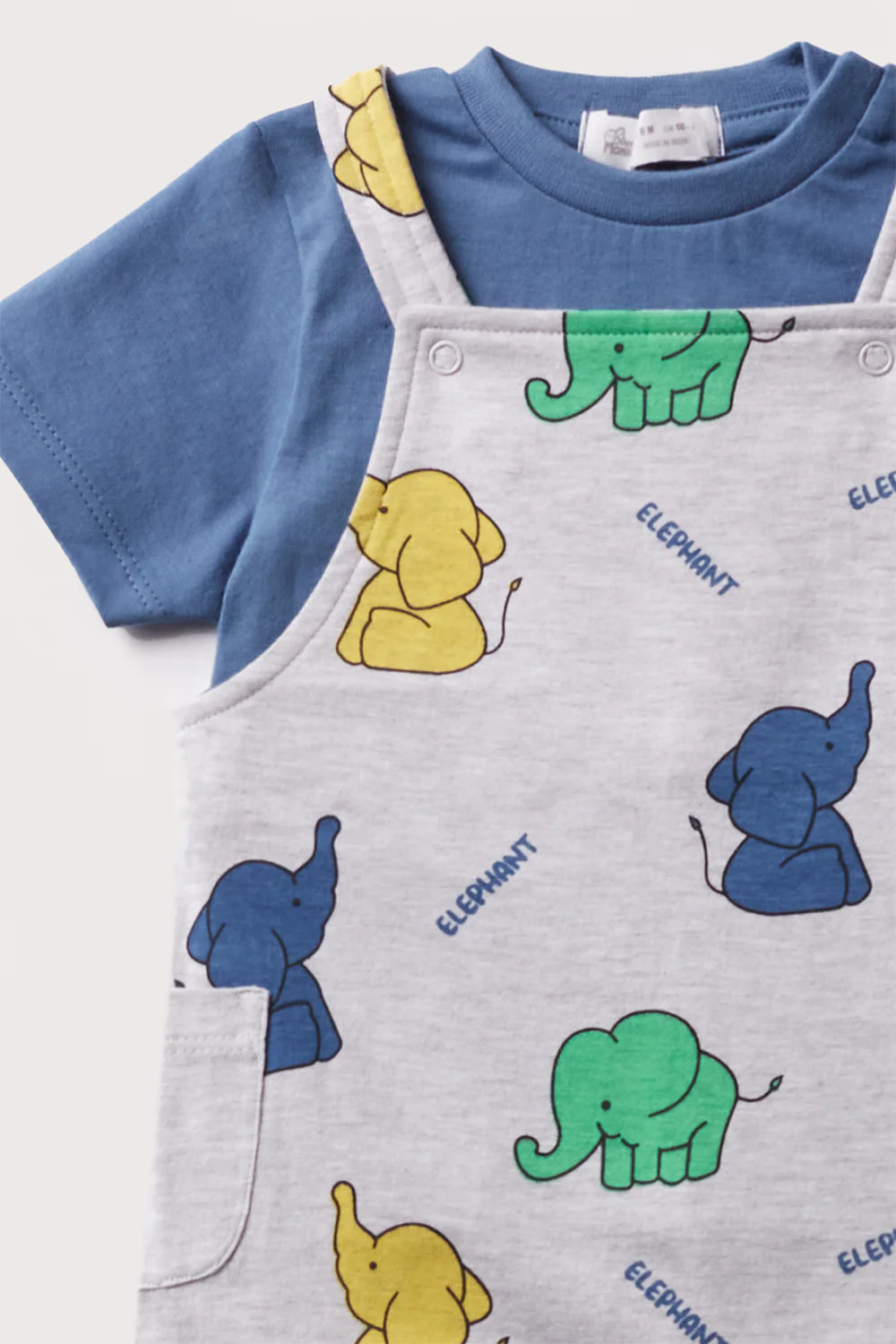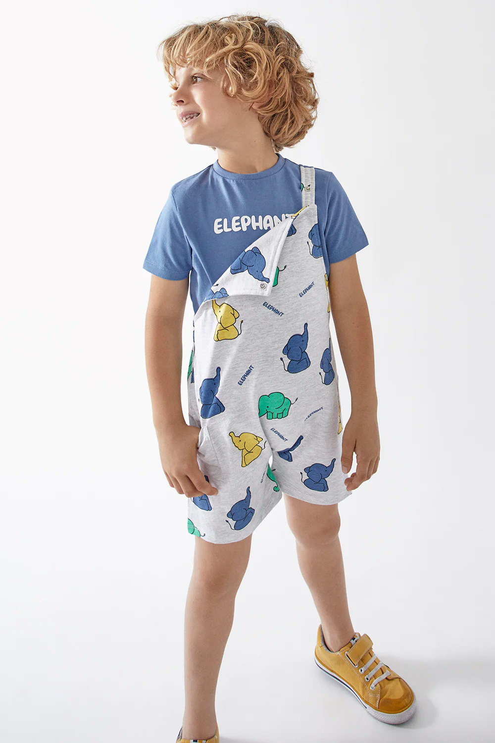 Conjunto camiseta de azul y peto perla con motivo elefantes.
