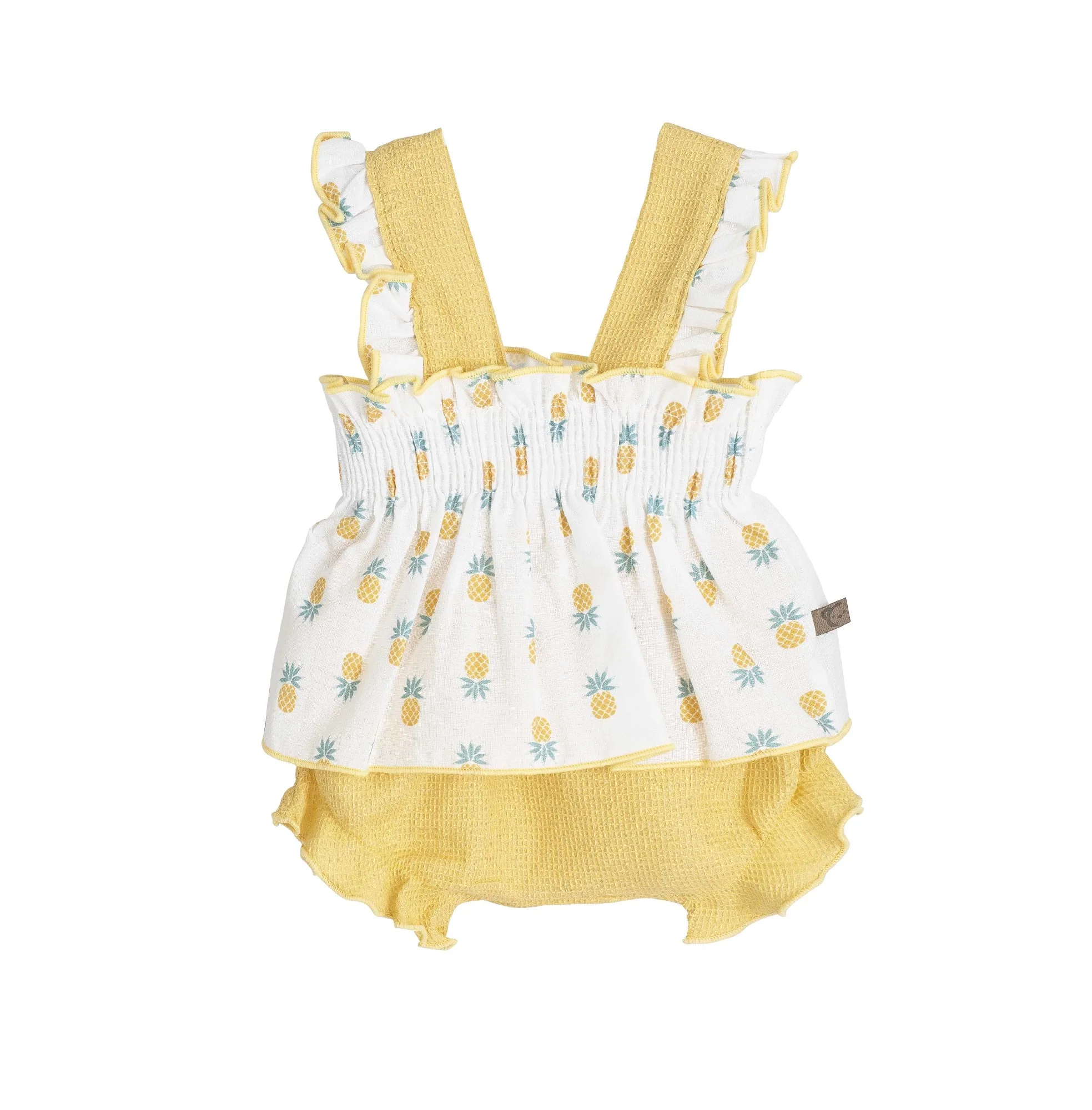 Conjunto «gaya» – Peto y Camiseta con Estampado de Piñas Viste a tu pequeño con la alegrÃa del verano. Este conjunto de dos piezas combina un peto de punto en amarillo vibrante con una fresquÃsima camiseta blanca de algodón, decorada con un divertido estampado de piñas. Un diseño cómodo, de aire artesanal y lleno de luz, perfecto para sus primeros pasos bajo el sol.
