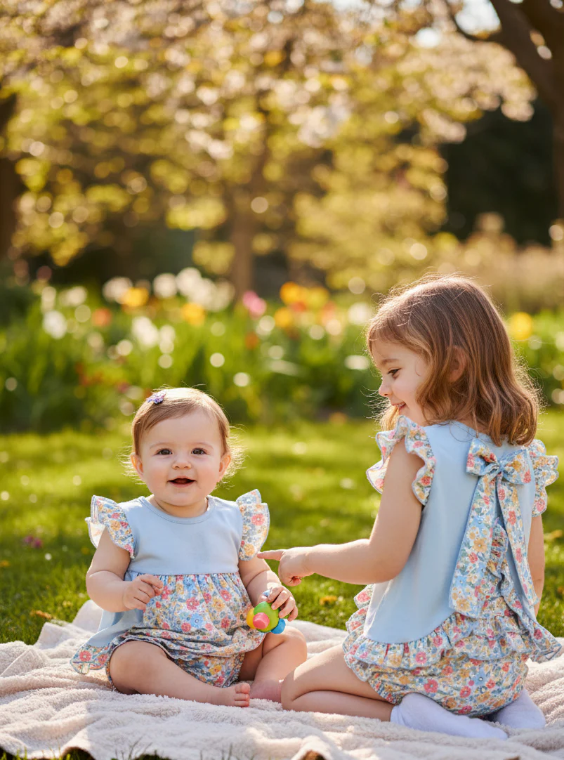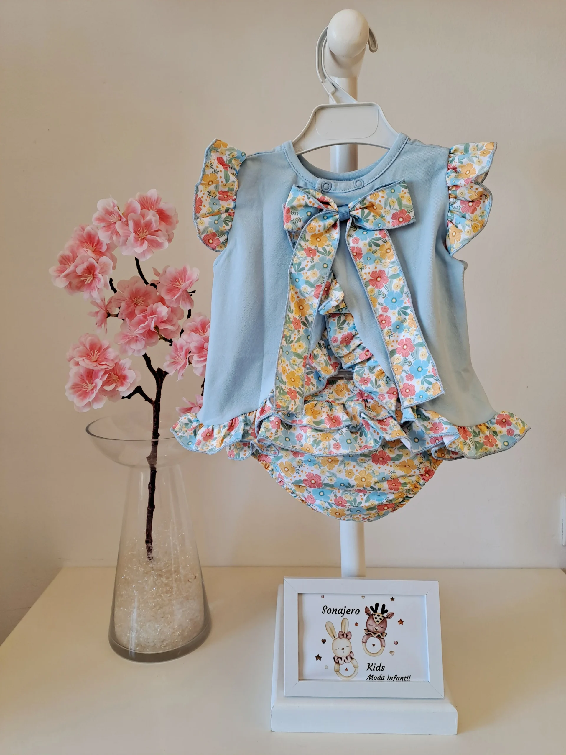 Conjunto de camiseta celeste con la espalda abierta y braguita de Flores .