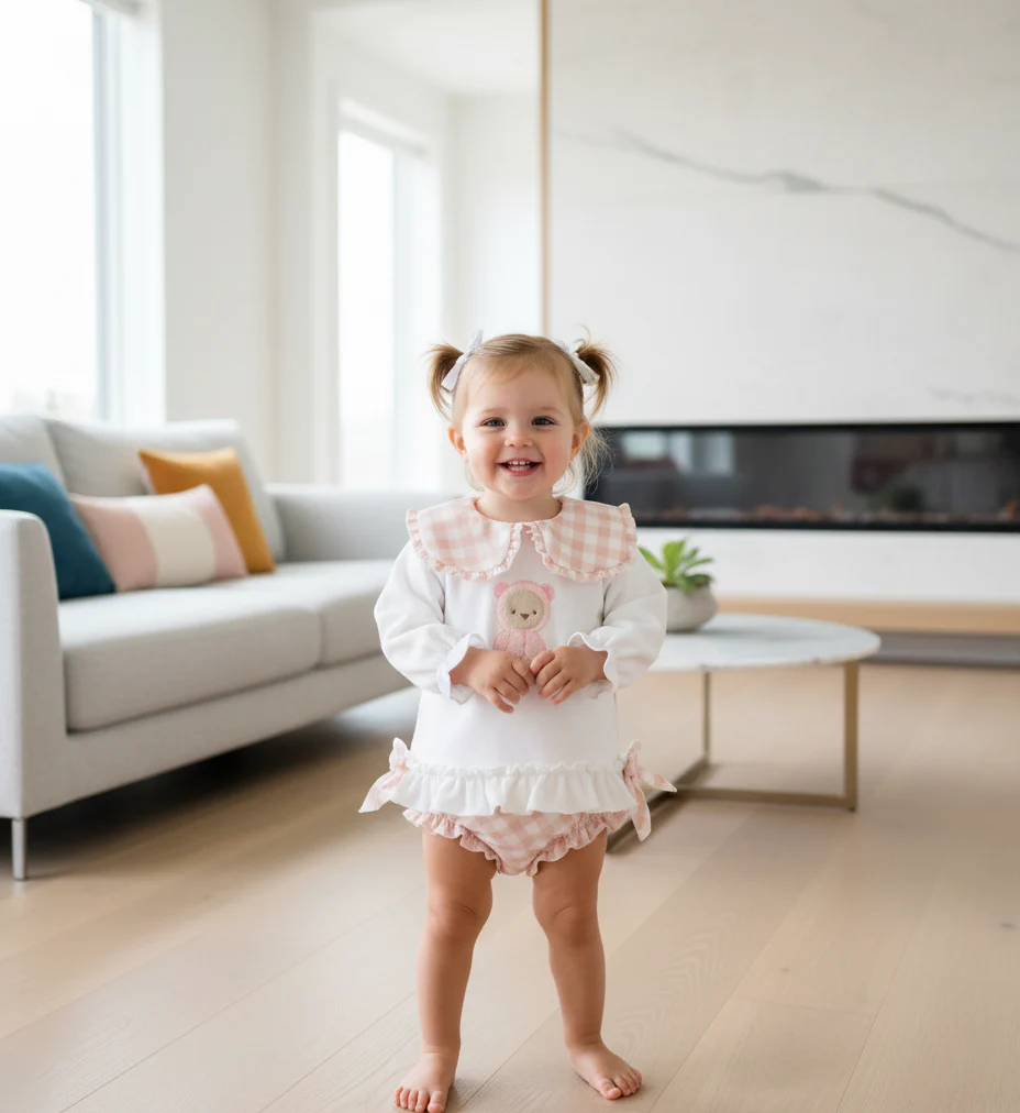En el centro del pecho tiene un bordado de osito en tonos rosa y beige.
