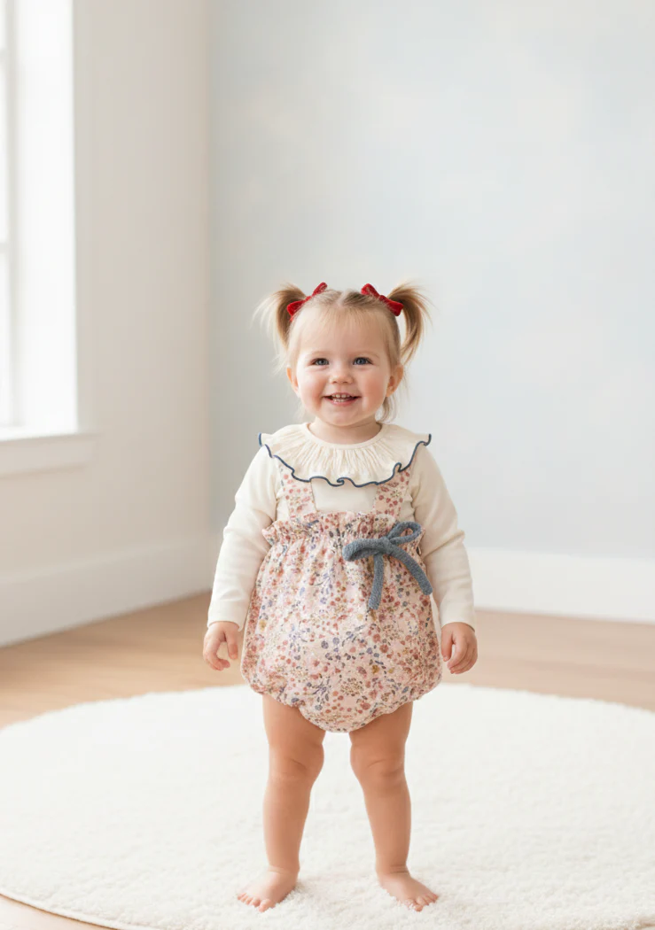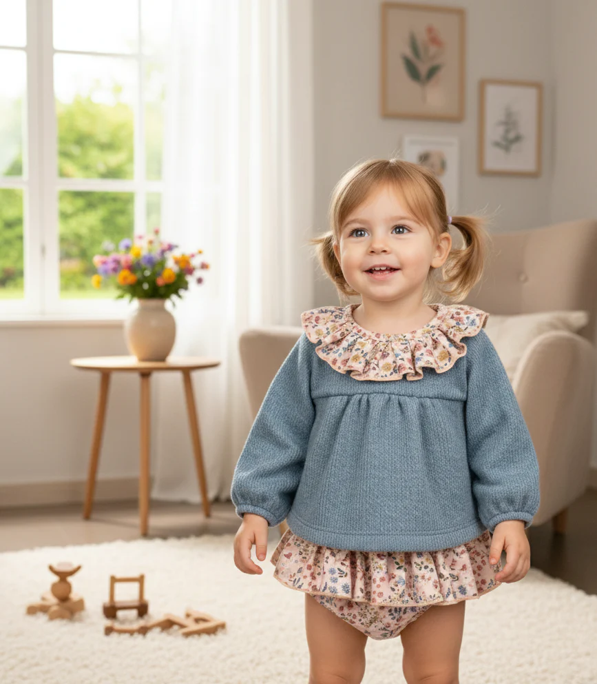 Conjunto pololo azul con volante en cuello y braguita de flores