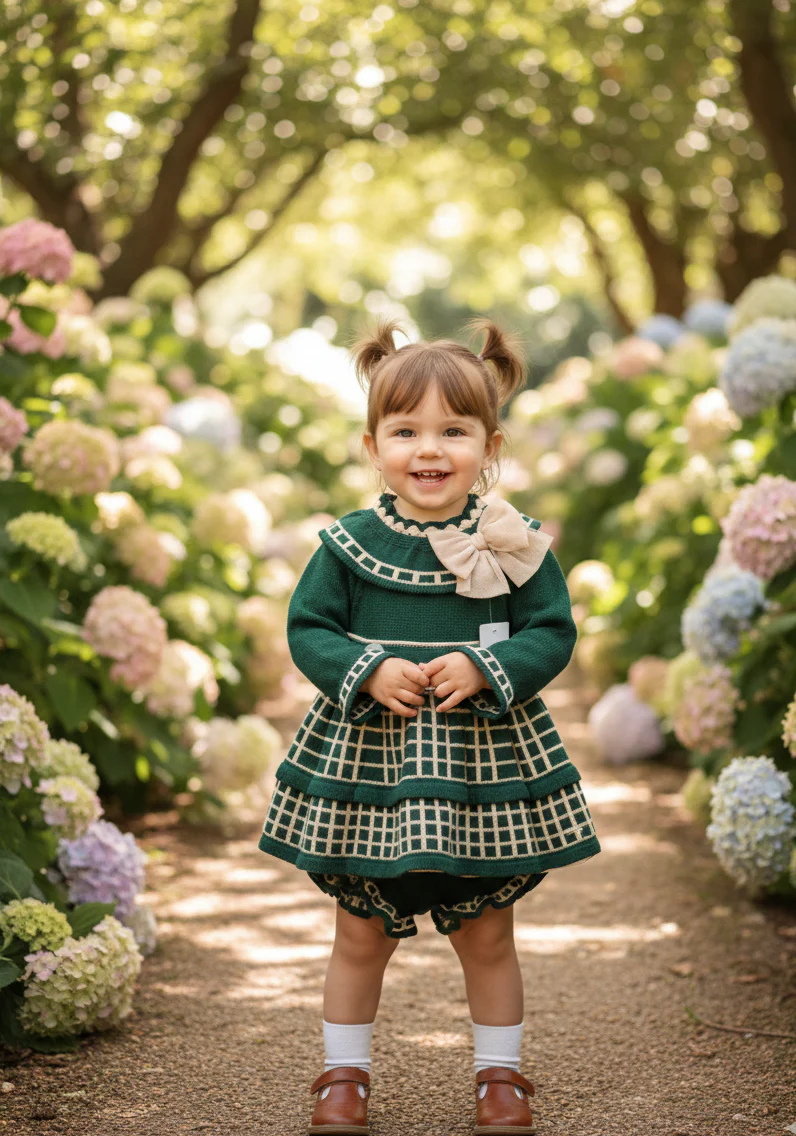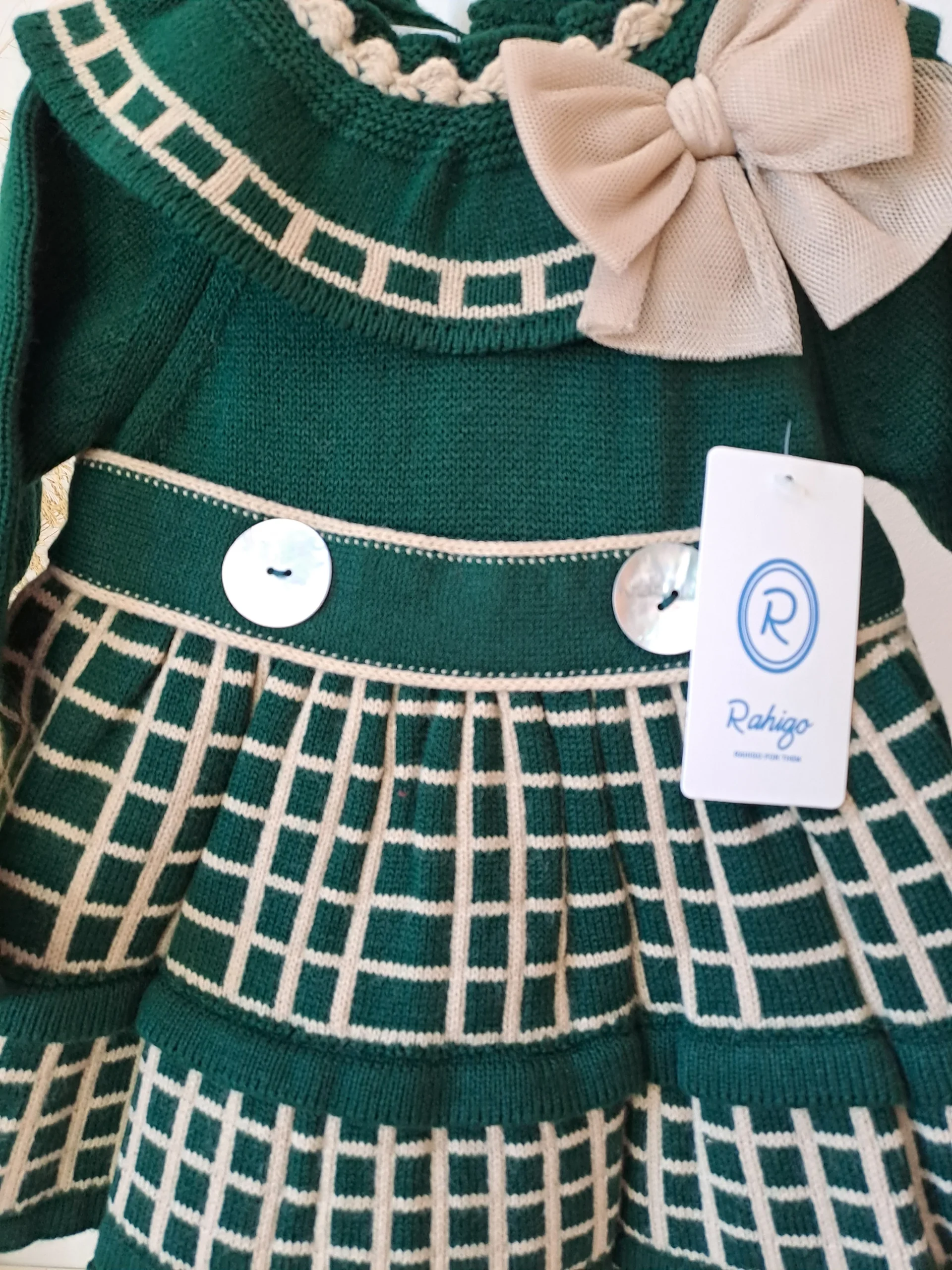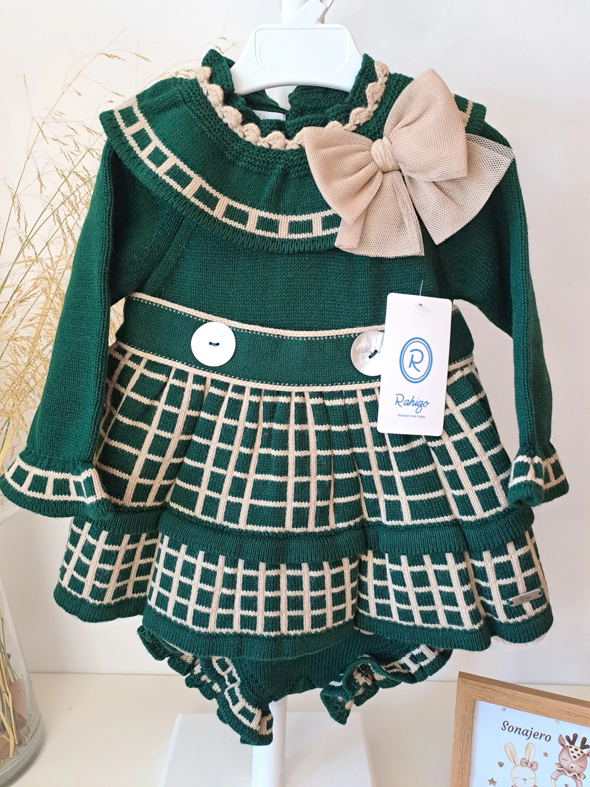 Vestido con volantes de punto en el cuello y lazo de tull, terminado en dos volantes de a cuadros beige