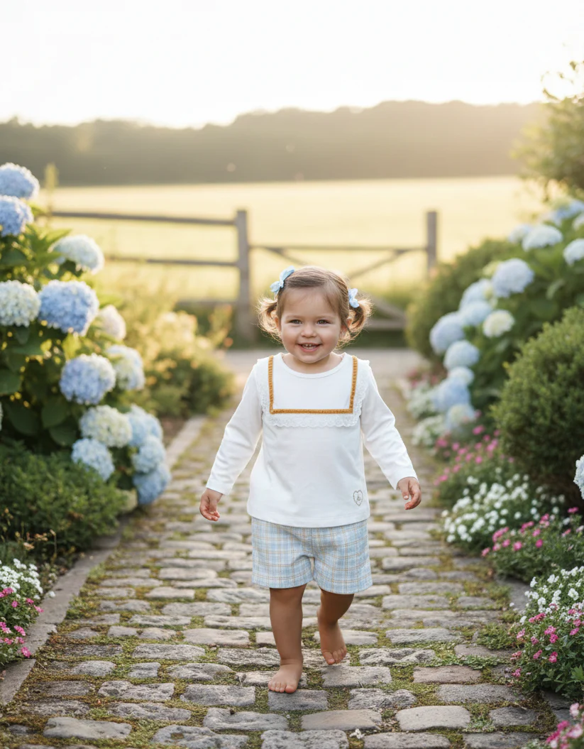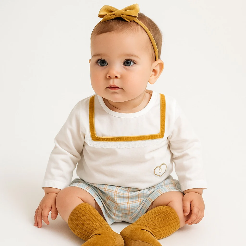 Este conjunto infantil destaca por su estilo clásico, dulce y artesanal. Se compone de dos piezas coordinadas: