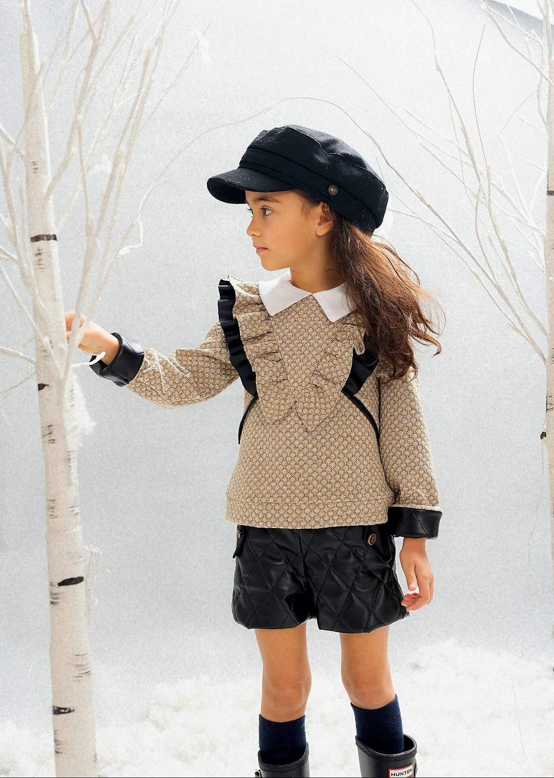 Blusa de manga larga: De color beige claro con un sutil patrón geométrico, la blusa presenta un diseño sofisticado con volantes en forma de “V” al frente, confeccionados en tela negra plisada. El cuello blanco tipo babero añade un aire clásico y delicado. Los puños también llevan detalles en tela negra acolchada, haciendo juego con el short.