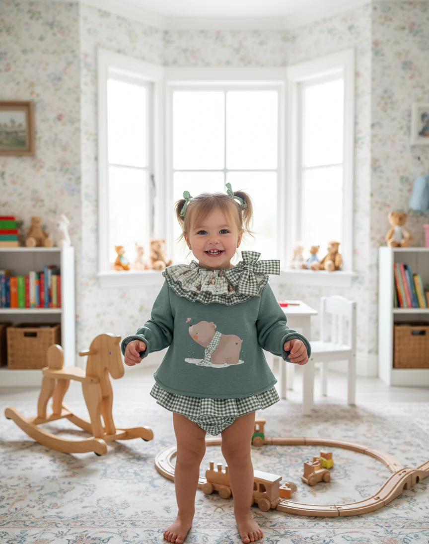 El conjunto infantil de sudadera y braguita 2 piezas de algodón color marino con un diseño clásico con estampado de oso y volante en el cuerpo con lazo , confeccionado en un material suave y cálido.