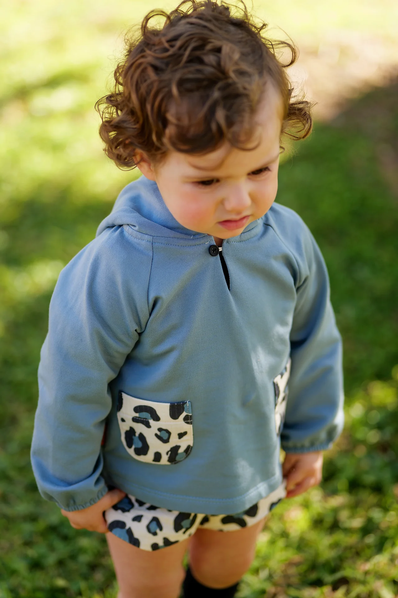 Conjunto sudadera con volante y braguita estampado animal print en azul y negro