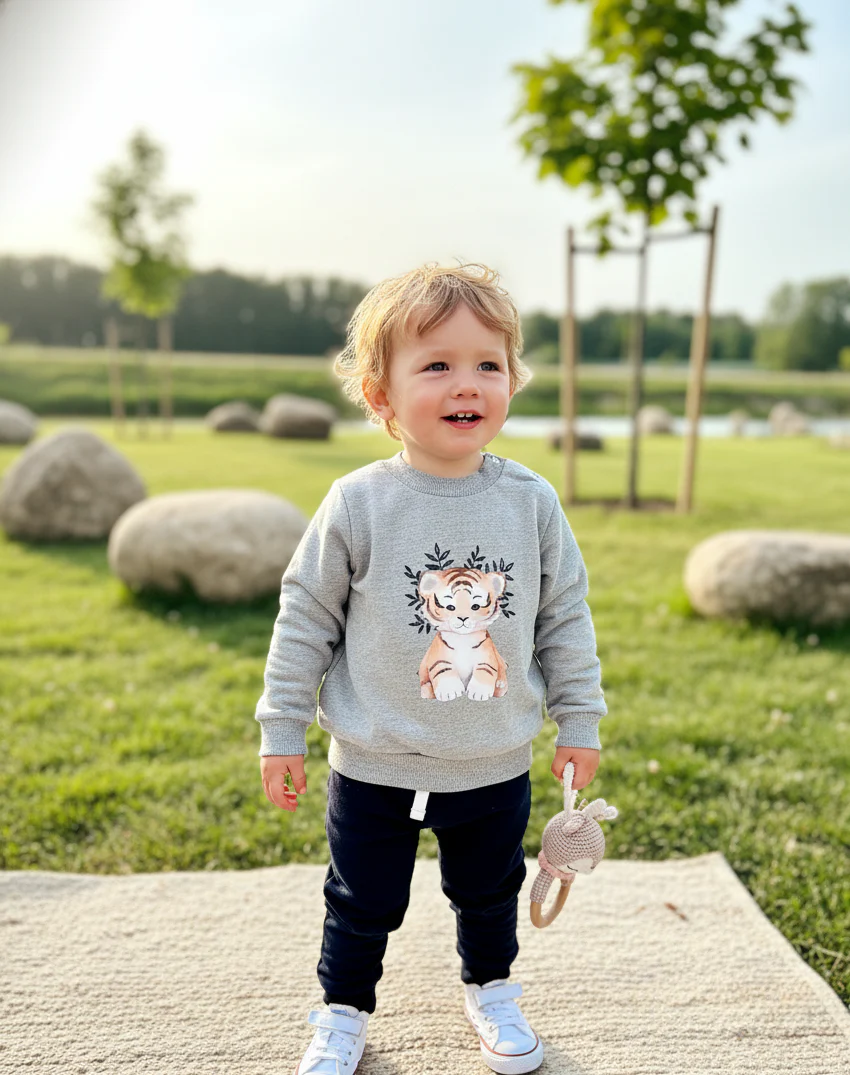 Conjunto de sudadera gris con estampado de tigrecito y pantalón afelpado marino.