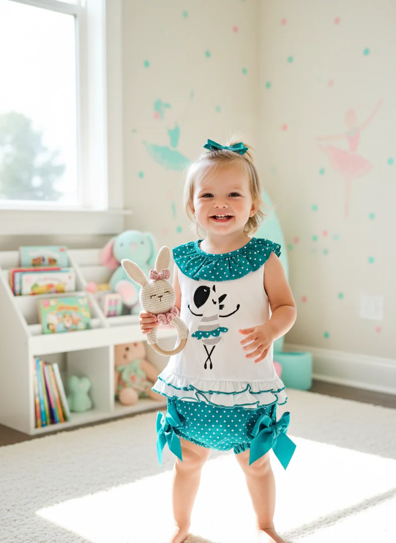 🪷 Conjunto turquesa con topos blancos y camiseta blanca, embárcate