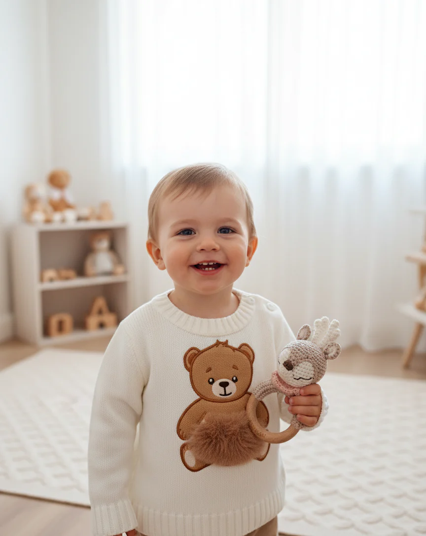 Este conjunto infantil es encantador y delicado, ideal para un bebé. Se compone de un suéter tejido en tono crema con un diseño adorable de un osito con un pompón en el centro. El osito tiene un pompón marrón lo que le da un toque tierno y expresivo. El suéter presenta botones en el hombro para facilitar el cambio de ropa y un acabado acanalado en los puños, el cuello y el borde inferior, lo que lo hace cómodo y cálido.