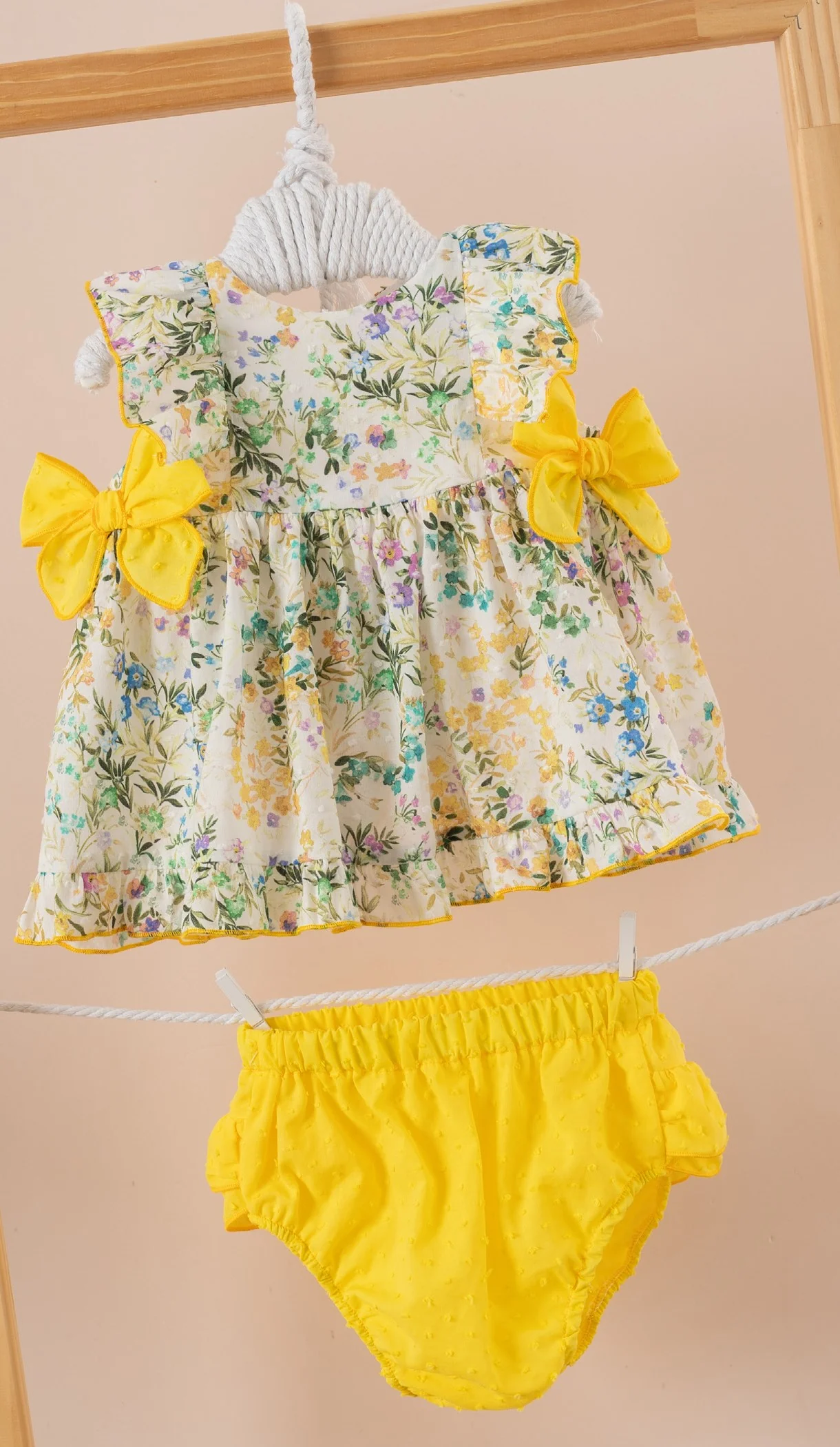 💛 Jesusito Floral, con lazos y braguita plimetti amarillo con apertura trasera abotonada .