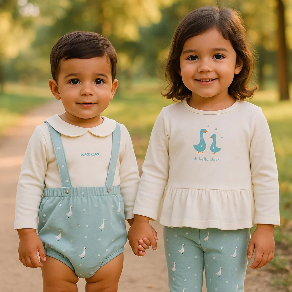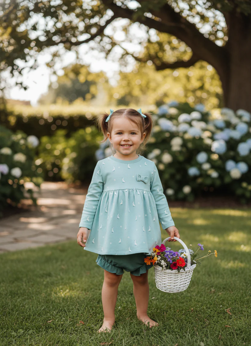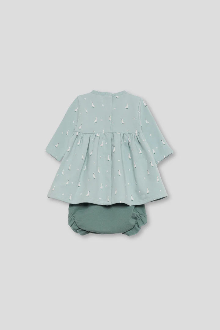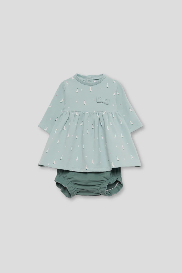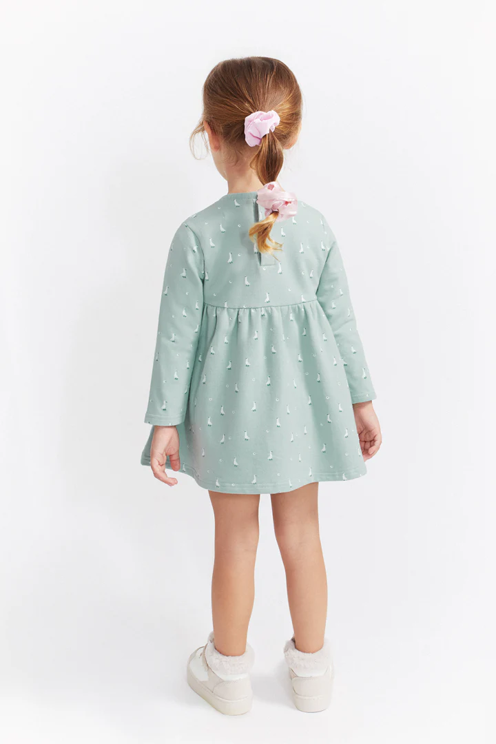 💚Vestido de manga larga para recién nacido de 1 a 24 meses. Vestido en color eucalipto con un delicado estampado de pequeños patitos en blanco, ideal para un look tierno y divertido. Presenta un diseño de corte con vuelo y frunce bajo el pecho que aporta amplitud y comodidad, además de un lazo decorativo a tono en el pecho. Está confeccionado en punto suave y elástico, con cierre de botones en la espalda en tallas pequeñas para facilitar la puesta. Una prenda dulce y funcional para acompañar con estilo los primeros paseos.💚