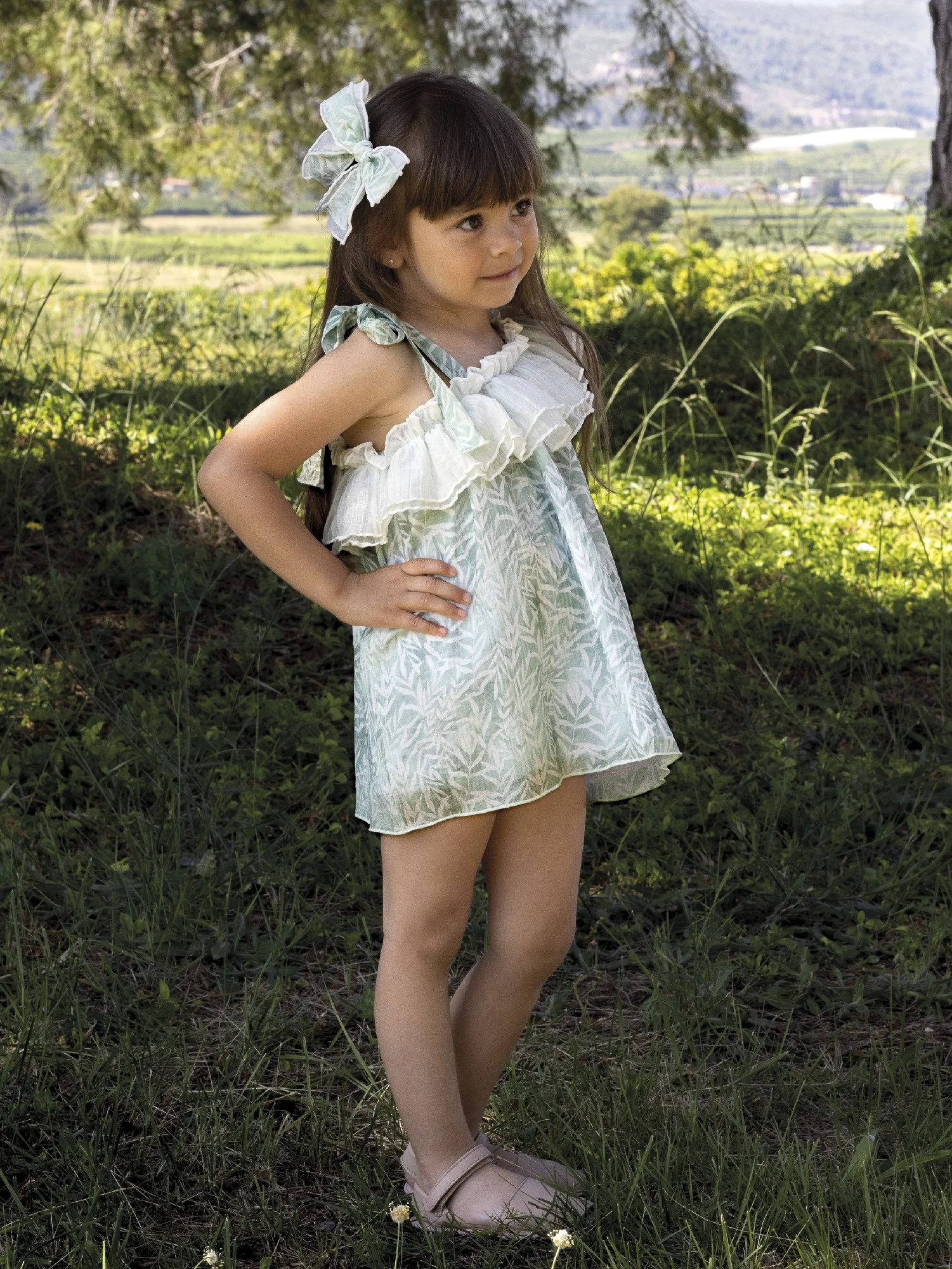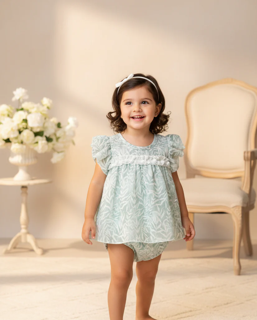Este conjunto infantil destaca por su aire fresco, romántico y sofisticado, ideal para ocasiones especiales de verano o sesiones fotográficas. Aquà tienes una descripción detallada de sus elementos: