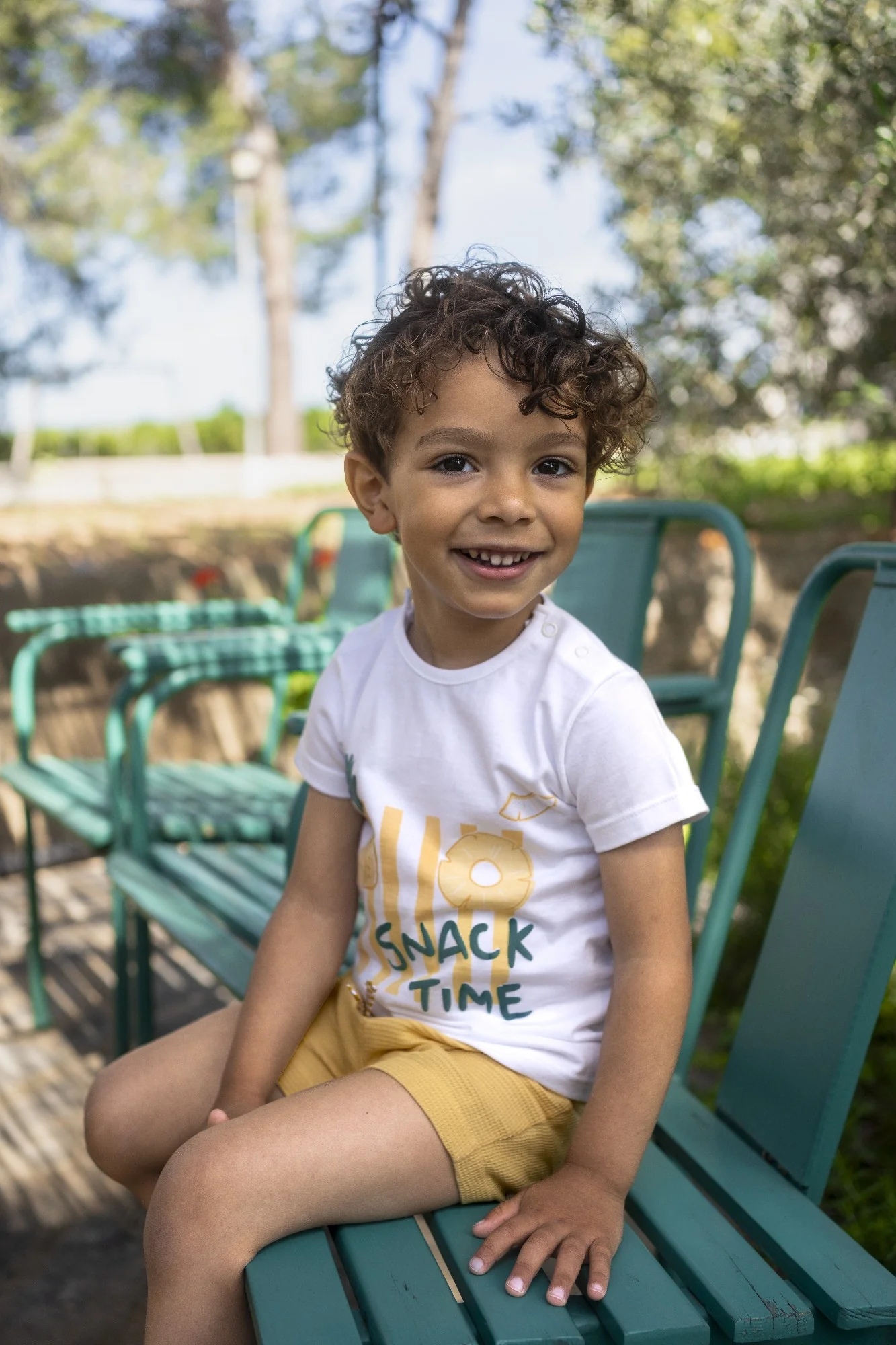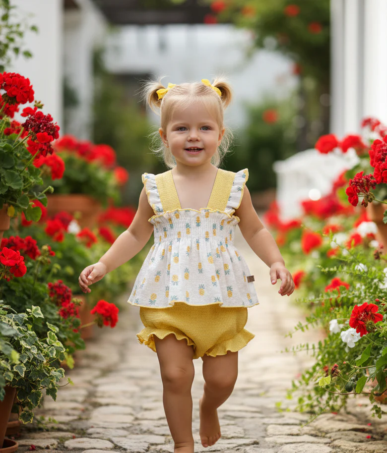 Este conjunto de la marca Calamaro destaca por un diseño dulce y atemporal. Se compone de una camiseta blanca de manga corta con un cuello bebé en tono beige a juego con la parte inferior. La falda (o pololo con falda) presenta volantes superpuestos que aportan volumen y un aire romántico, todo confeccionado en tejidos suaves ideales para la piel delicada. Es una prenda clásica, elegante y perfecta para ocasiones especiales.