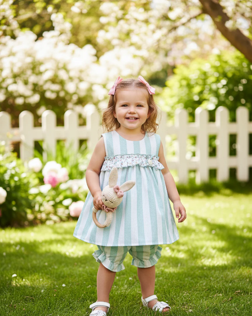 💙 Jesusito de rallas Verde empolvado, de braguita y tira fruncida. 🩵