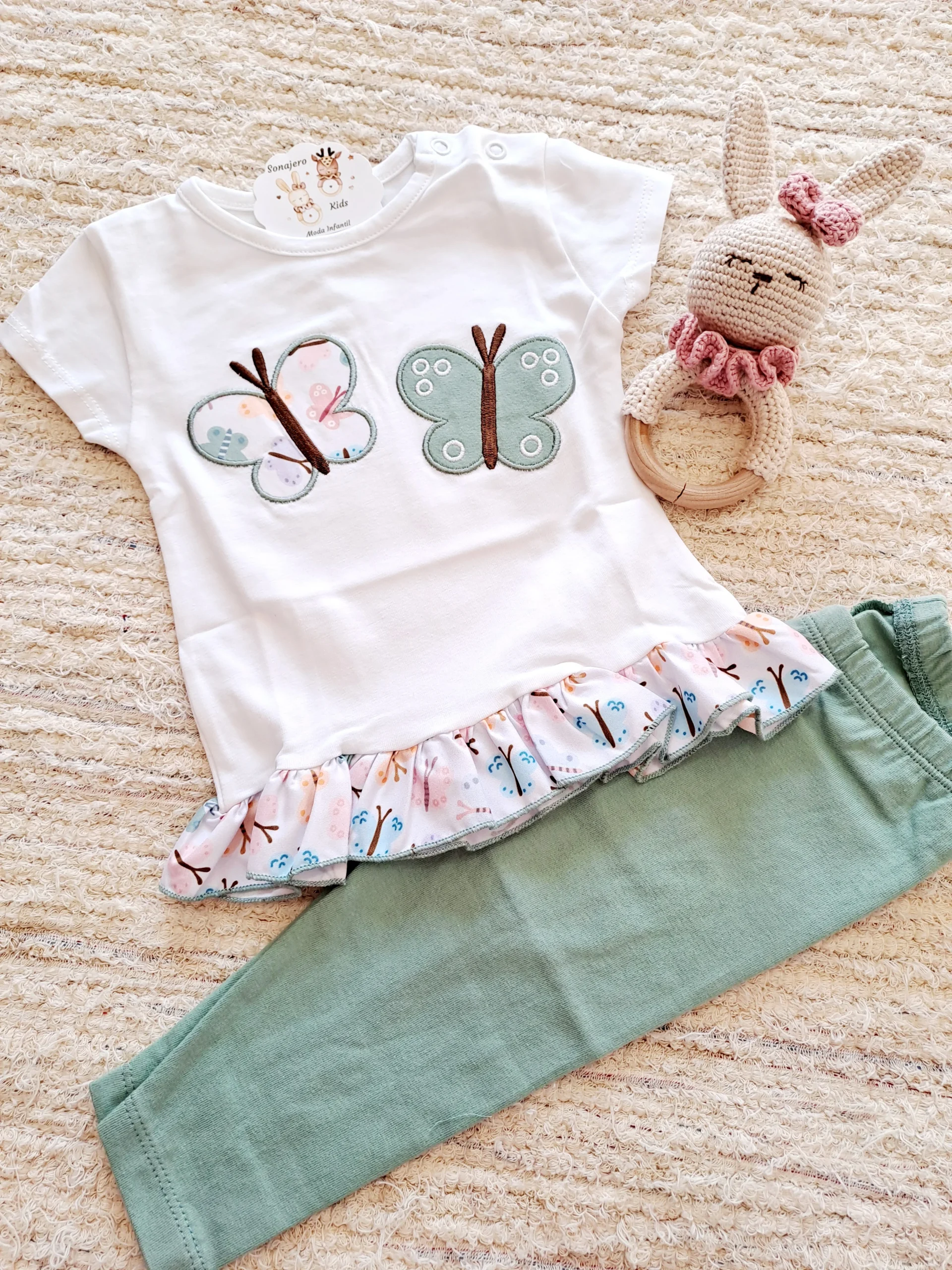 💐Conjuntos leggins color verde empolvado con volante en el hombro niña de estampado Primaveral💐