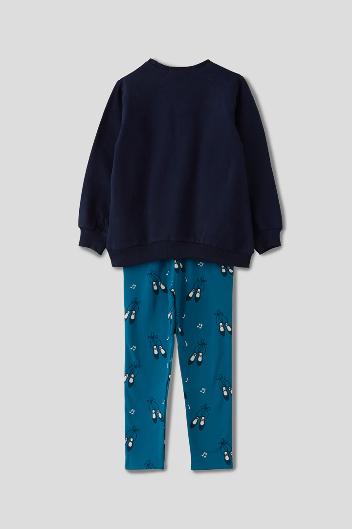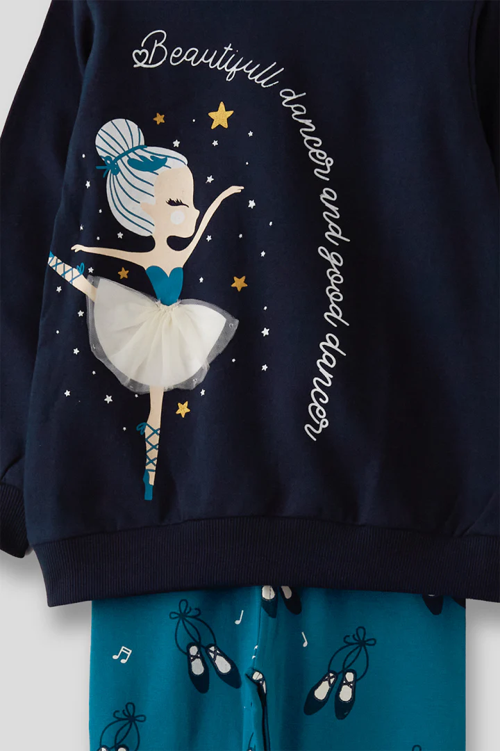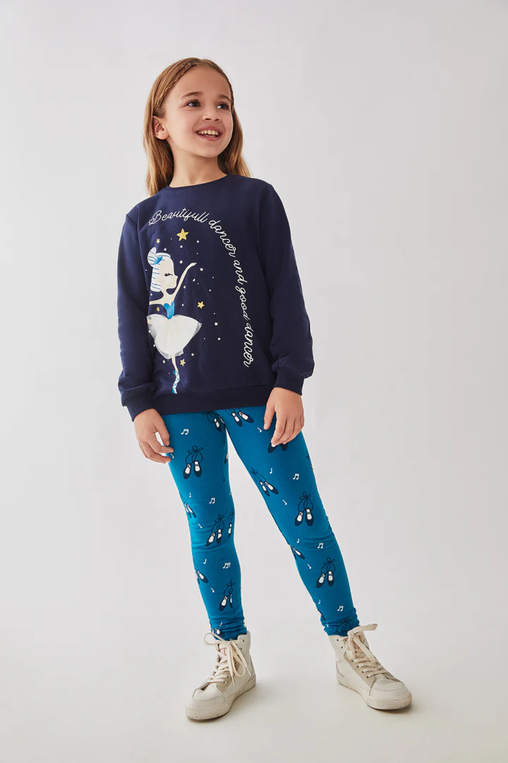 Conjunto para niña en color marino. Este encantador conjunto presenta una sudadera de manga larga con un hermoso diseño de bailarina y la frase «Beautiful dance and good dance» en el pecho, acompañada de unos leggings azules decorados con motivos de zapatillas de ballet y notas musicales. Confeccionado en un tejido suave y cómodo, este conjunto es perfecto para el uso diario y cualquier actividad. La sudadera en color marino combina fácilmente con los leggings, creando un look armonioso y divertido que hará que tu pequeña se sienta como una verdadera estrella del ballet. Ideal para las pequeñas amantes de la danza y los sueños mágicos, este conjunto les permitirá expresar su pasión y estilo con alegría. Este conjunto es una opción práctica y moderna para cualquier ocasión. ¡Haz que tu hija luzca encantadora ya la moda con este conjunto divertido y elegante!