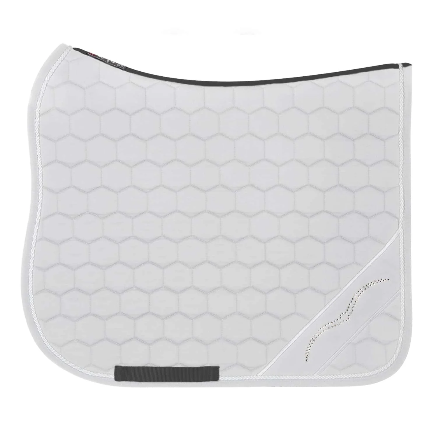 - Mantilla de doma de algodón con logo Albatros en pedrerÃa aplicado sobre banda oblicua tono sobre tono, pipino blanco y cenefa tono sobre tono.