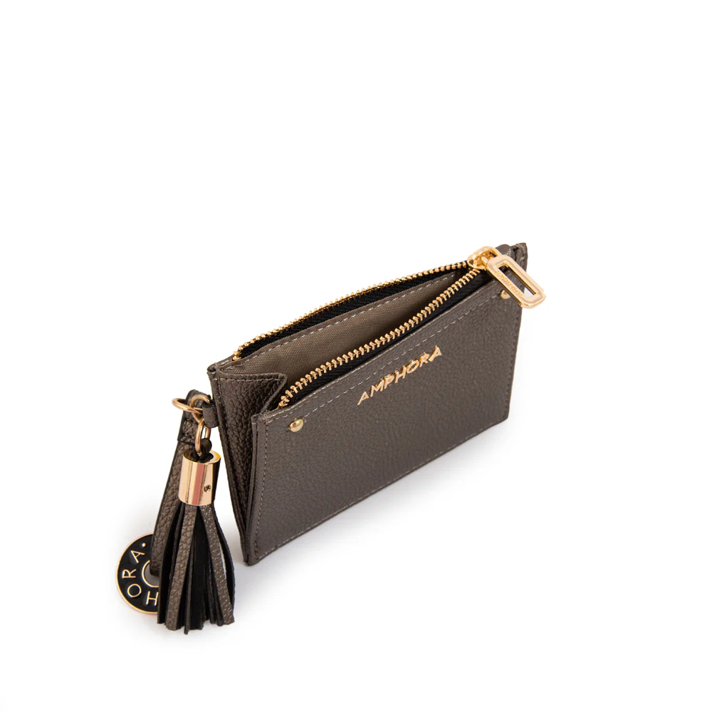 Shine bright with every detail. En plateado oscuro, el monedero Etiopía le da un giro moderno a tus accesorios. Su textura en ecocuero graneado y su borla en el mismo tono lo convierten en una pieza versátil para cualquier ocasión.