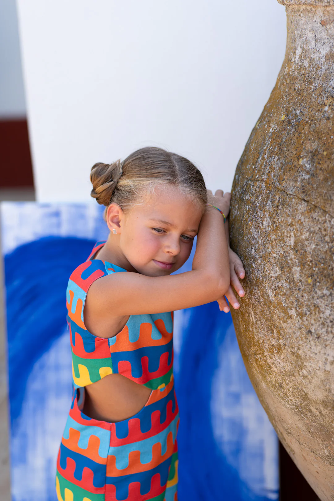 Dale un toque de energía y estilo retro al armario de los más pequeños con este mono corto de diseño vanguardista. Con un estampado geométrico de ondas entrelazadas, esta pieza combina una paleta de colores primarios y vibrantes que no pasa desapercibida.