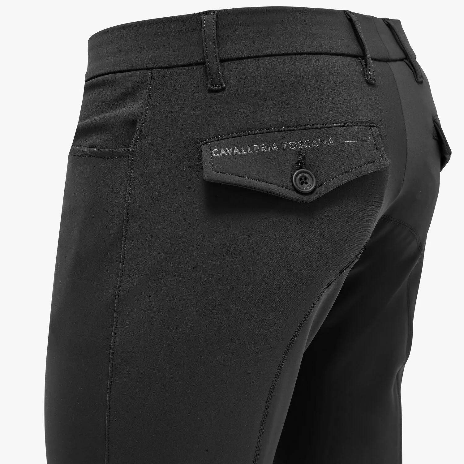 - Los bolsillos traseros con solapa y botón están personalizados con letras de Cavalleria Toscana.
