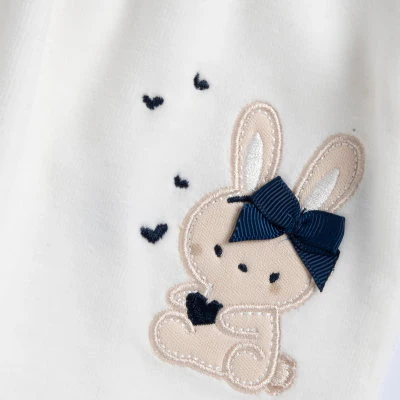 Decorado con un bordado de un conejito beige con lazo azul marino y pequeños corazones a su alrededor.