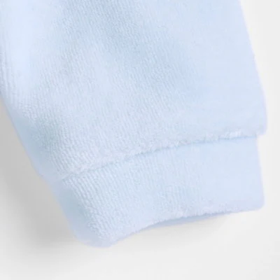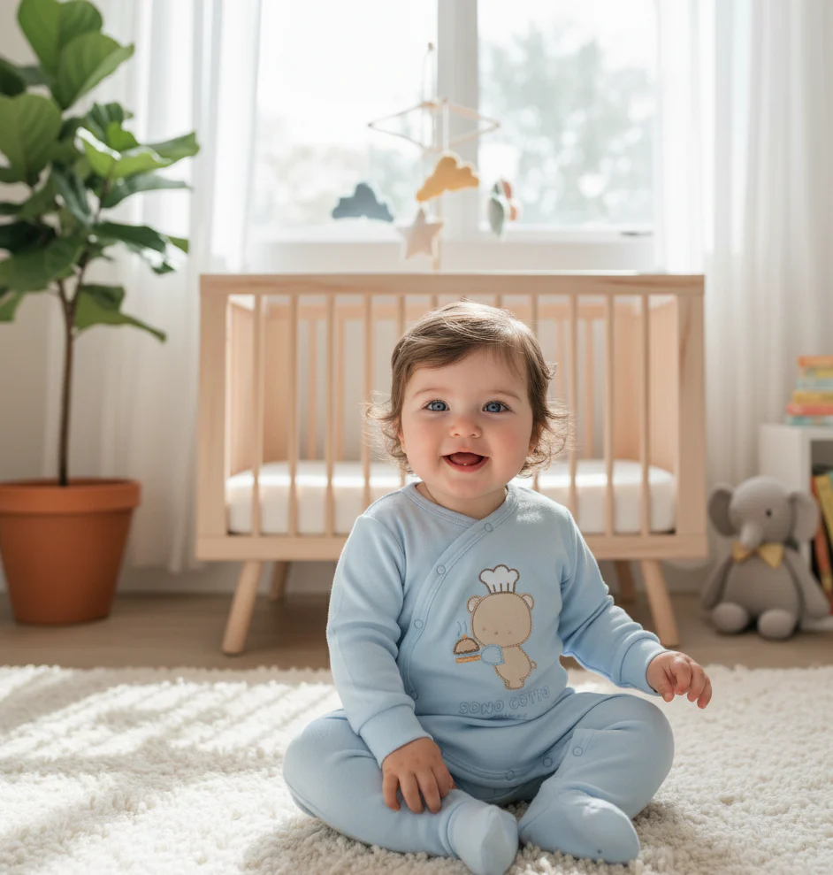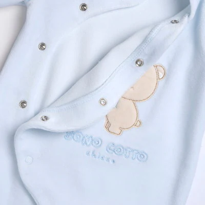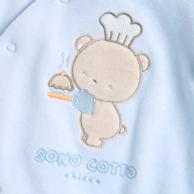 Este adorable pijama enterizo para bebé está confeccionado en suave algodón blanco, ideal para brindar comodidad y calidez a los más pequeños. Cuenta con un encantador diseño bordado en el frente de un osito cocinando en tonos celestes, acompañados del texto «Sono Cotto Chicc», lo que le aporta un toque tierno y acogedor.