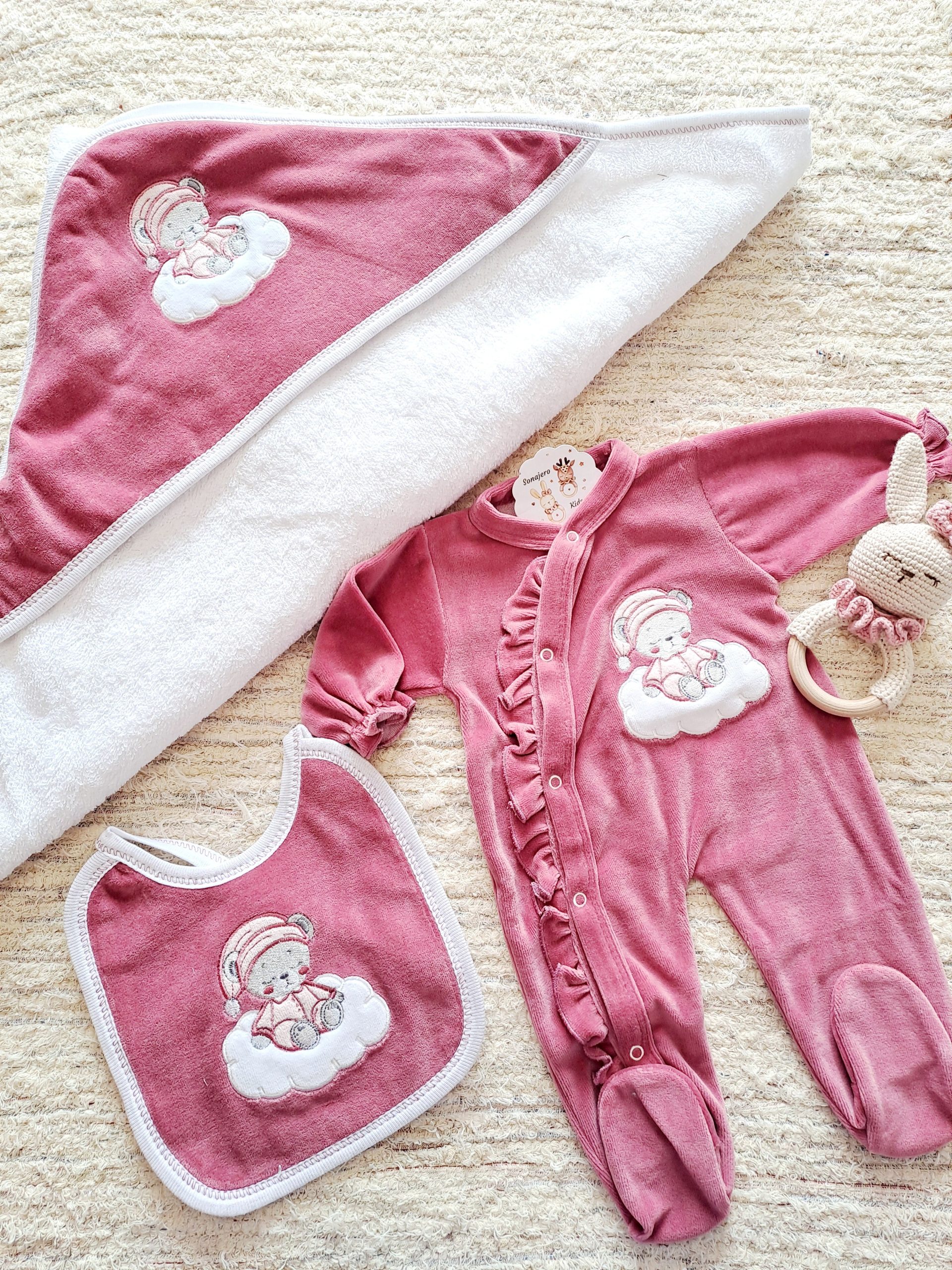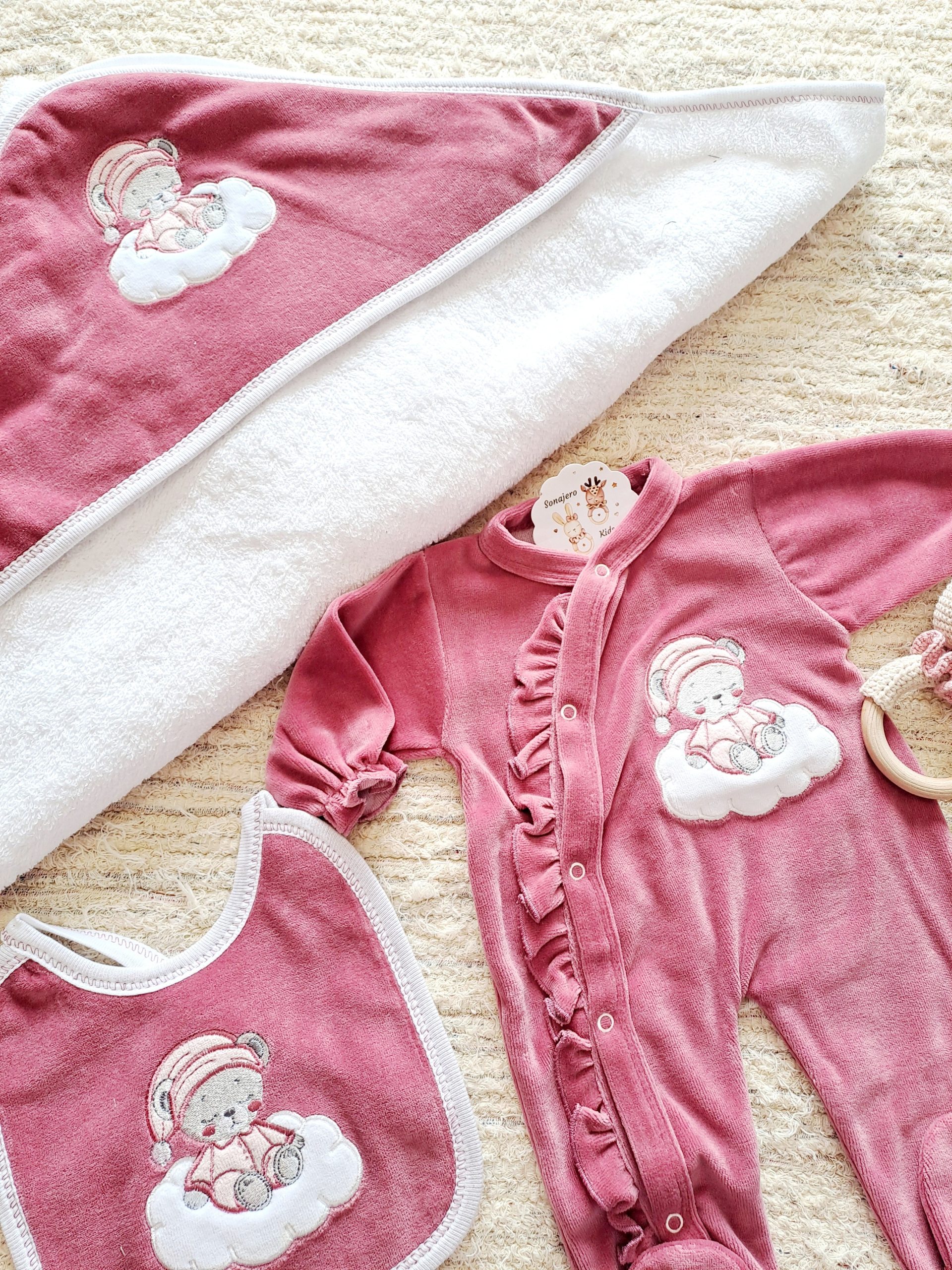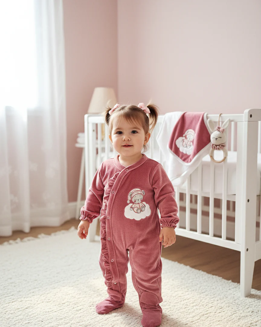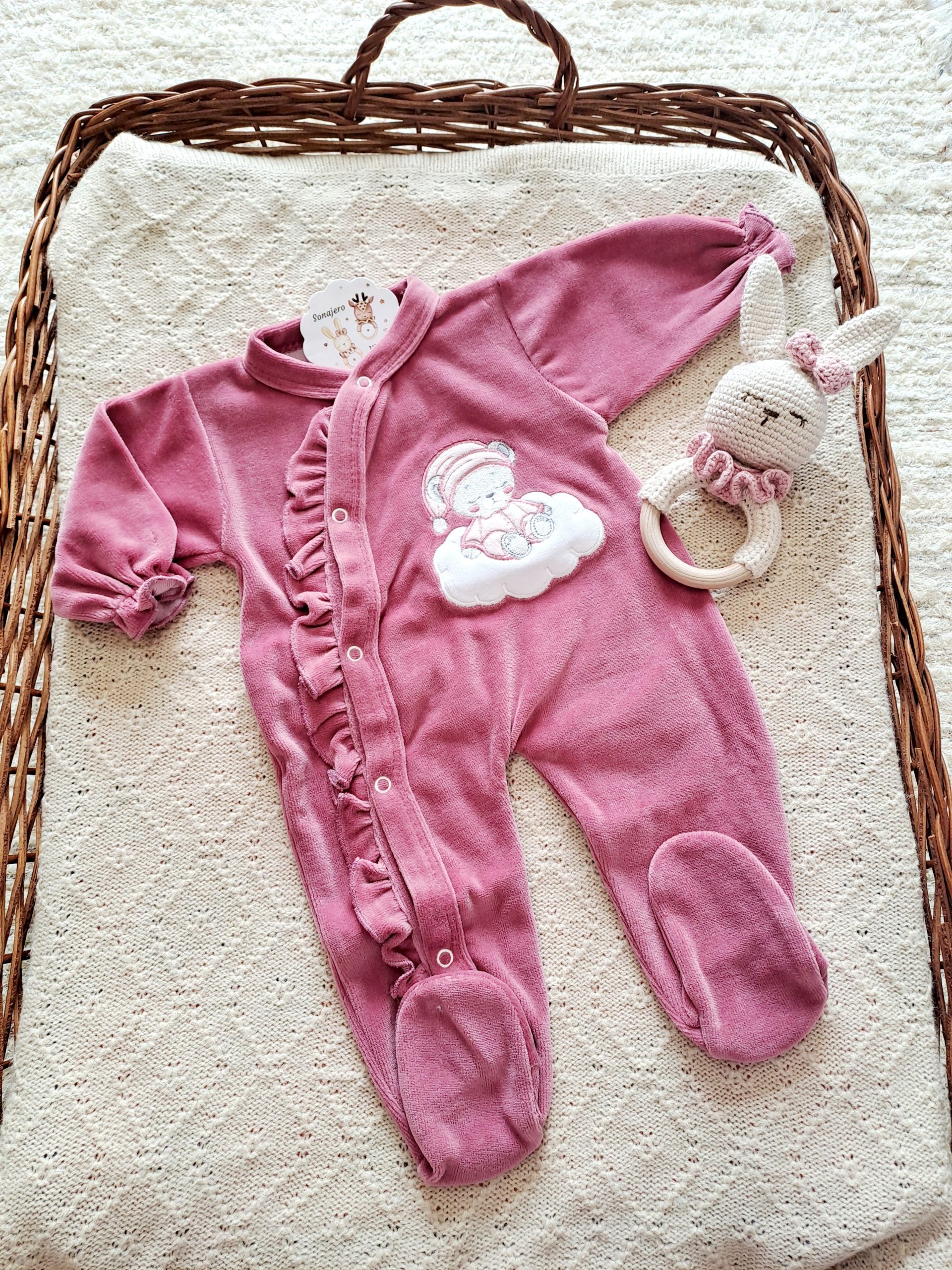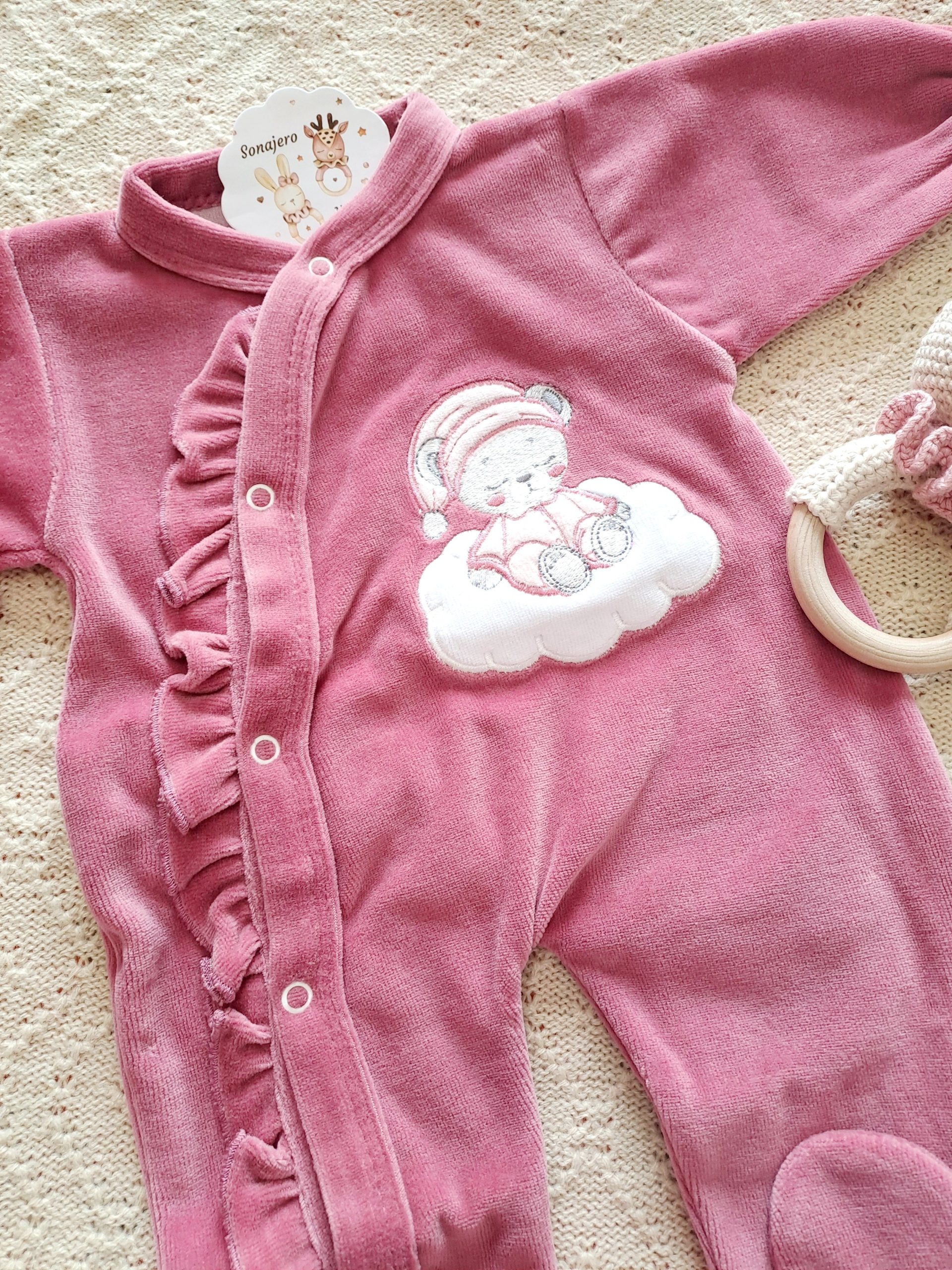 pelele de algodón de color bugambilla de apertura delantera con volantito decorativo bordad de un osito en una nube