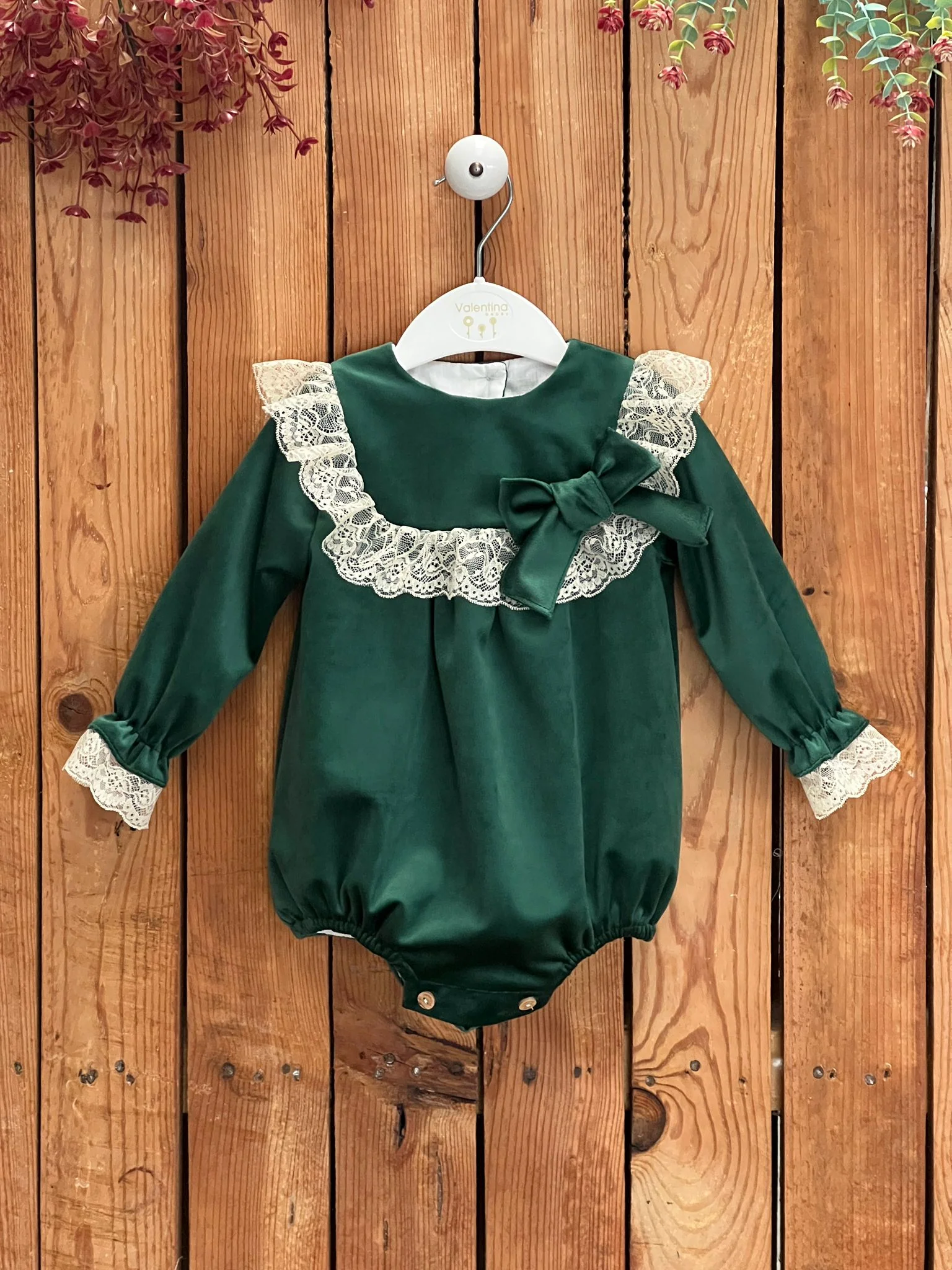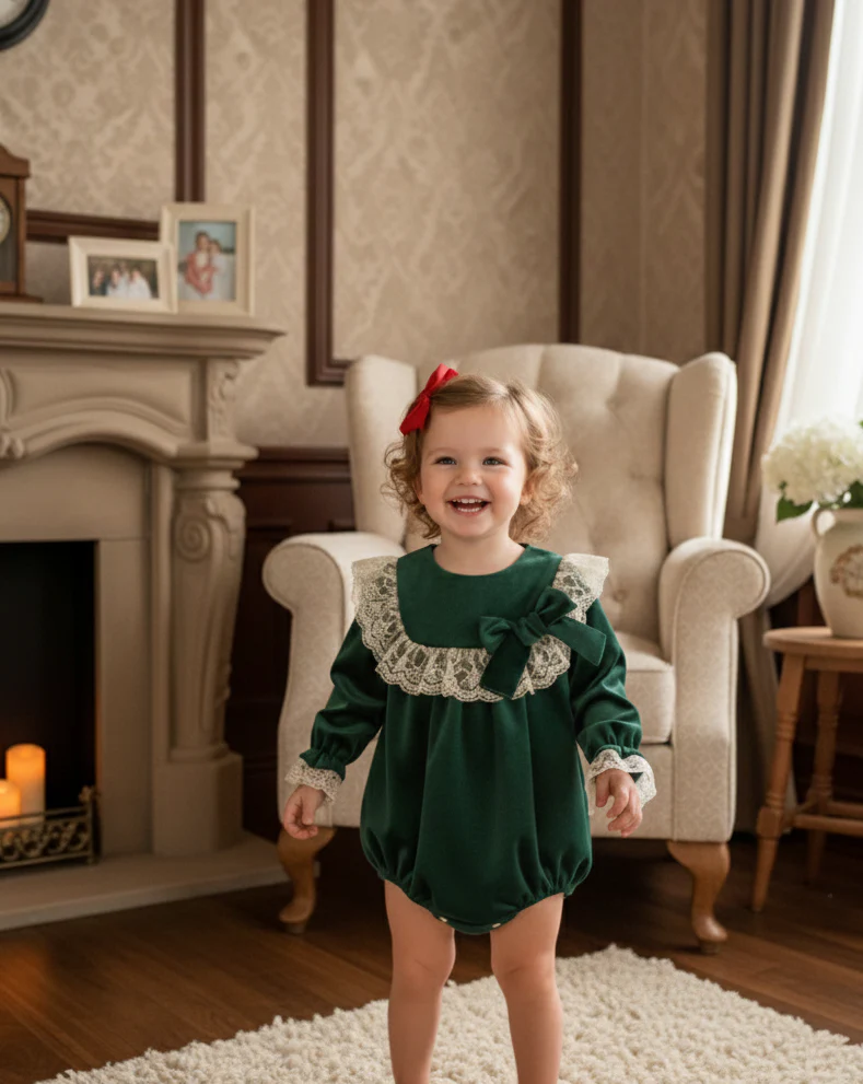 El conjunto infantil de una piezas de terciopelo color verde con un diseño clásico con un lazo y volante en el cuerpo y los puños , confeccionado en un material suave y cálido.