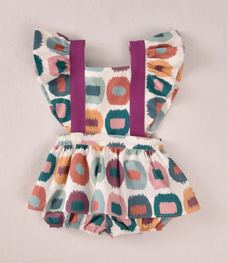 Es una prenda ideal para ocasiones especiales o sesiones fotográficas gracias a su presencia visual. El diseño realza la figura de los más pequeños manteniendo la comodidad, y el contraste entre el púrpura liso de los tirantes y el patrón multicolor lo convierte en una pieza única y muy fotogénica.