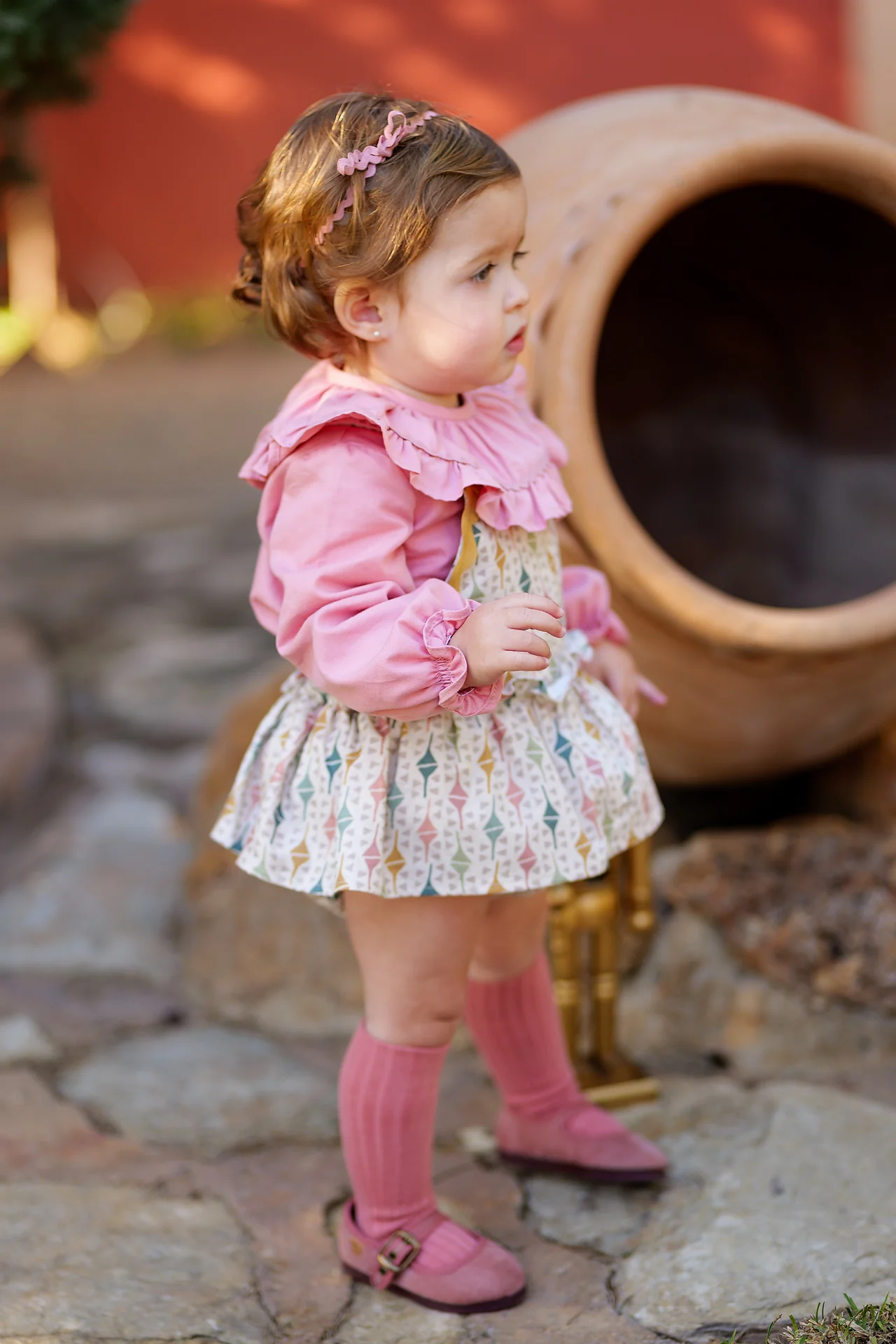 Estampado: Tiene un patrón geométrico con formas de diamantes estilizados en tonos pastel: rosa, mostaza, verde, azul y coral, sobre un fondo claro.