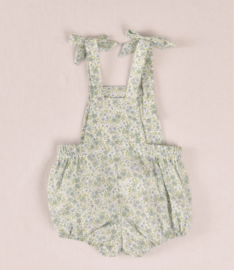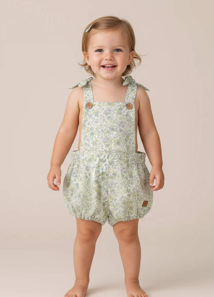 Peto Bombacho Floral de Algodón Este encantador peto de corte bombacho destaca por su delicado estampado floral en tonos verdes y azulados. Confeccionado en tejido suave y ligero, incluye tirantes ajustables con lazada y botones frontales de madera que aportan un toque rústico y natural. Una prenda cómoda y fresca, perfecta para los dÃas de sol.