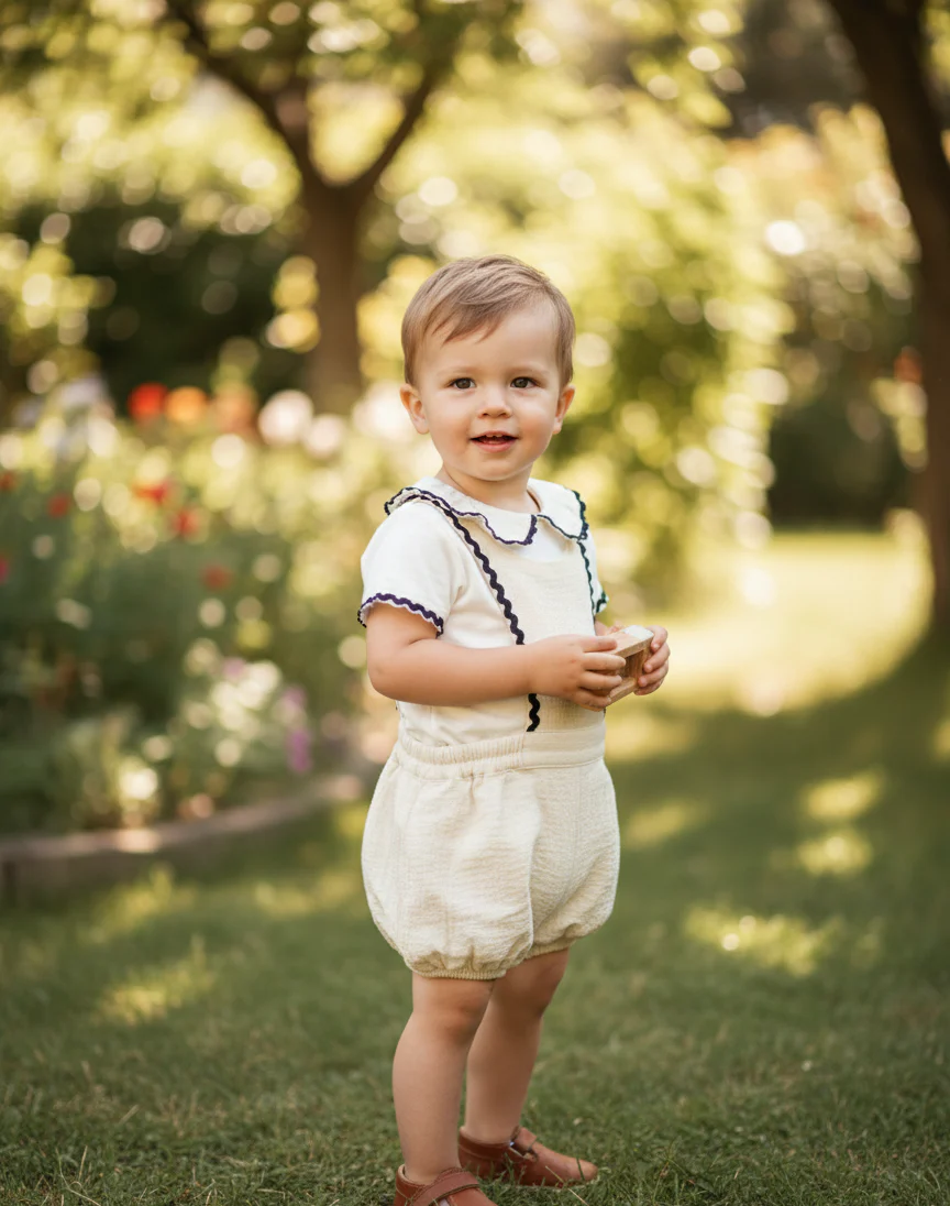 Peto con un diseño muy original liso crema con piculina negra y botones traseros negros, y camisa de diseño exclusivo