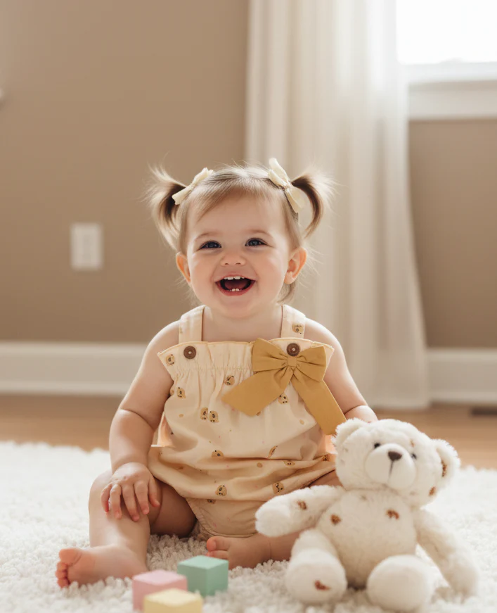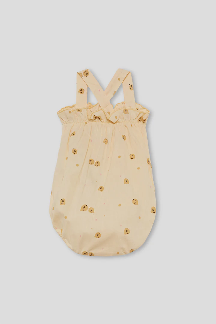Ranita con tirantes para bebé niña de 3 meses a 6 años. Ranita en color maíz con estampado de pequeños pollitos y lunares. Diseño con tirantes que se cruzan en la espalda y botones en la parte delantera para mayor ajuste. Destaca el lazo decorativo en tejido liso al tono colocado en la cintura, que aporta un aire delicado y coqueto. La prenda cuenta con goma elástica en las piernas para un mejor ajuste y comodidad en el movimiento. Confeccionada en tejido ligero y transpirable, perfecta para los días cálidos de verano.